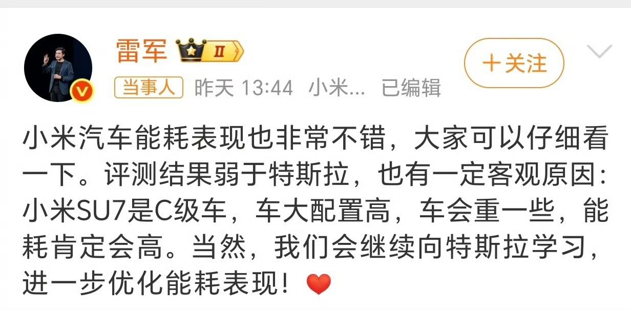 陈震:雷总谦虚了,SU7比Model3车长长了227mm,轴距长了125mm,车重也重了两三百公斤,根本不是同一个级别的车,能耗高点纯属正常现象……… 小米SU7的能耗表现实际上已经是相当的优异了,毕竟车型大了不止一圈呀,这还是小米的第1款产品,等到历经几代的优化之后,能耗表现肯定会更加的强。 影响能耗表现的因素有非常的多,除了风阻、重量、轮胎之外,还有非常多的小细节可以进行优化。各位是怎么看的?欢迎评论区留言。
