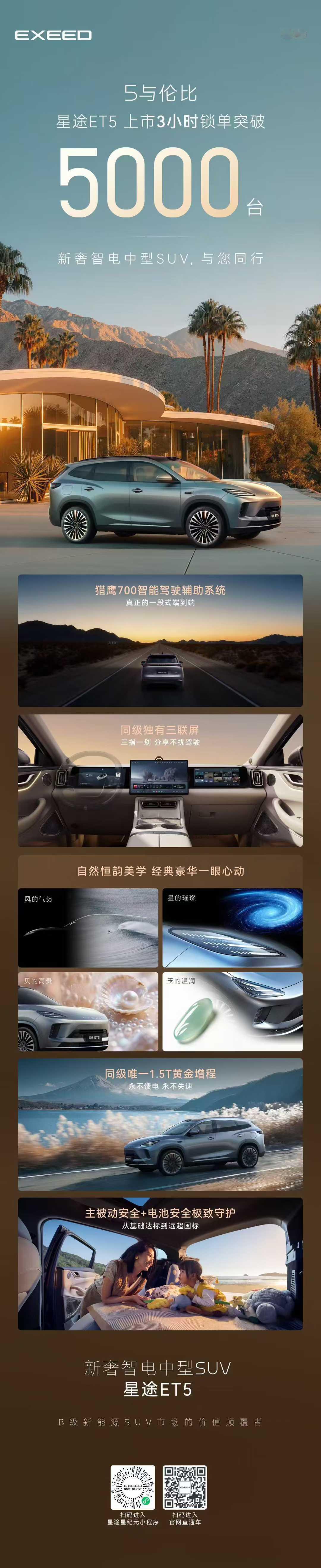 上市3小时锁单突破5000台! 感谢您选择星途ET5 新奢智电中型SUV,与您同行 15万级智驾首选星途ET5 5与伦比TheBest5 EXEED星途汽车
