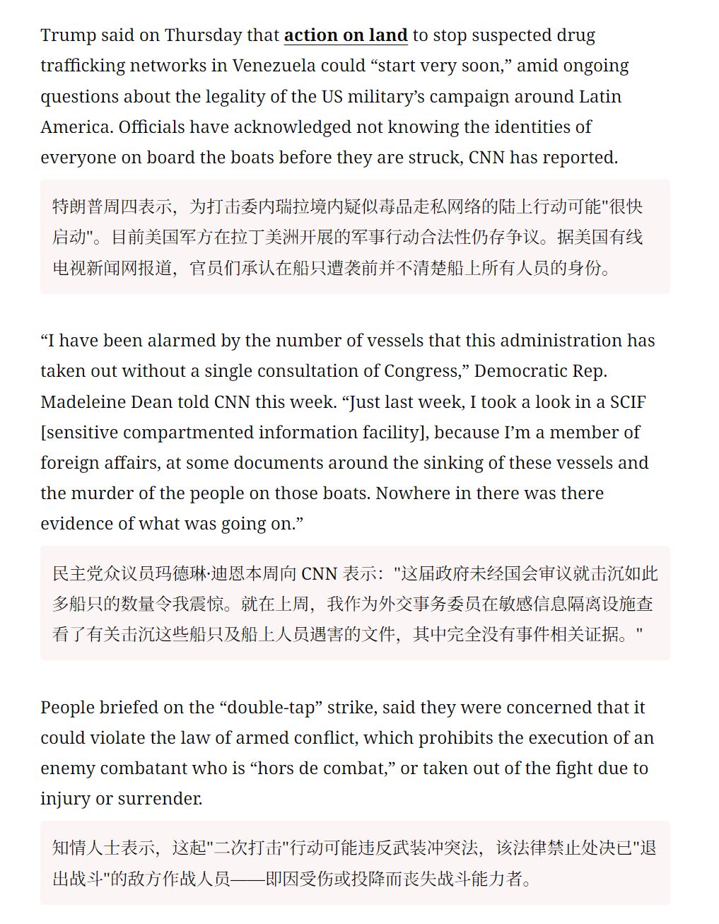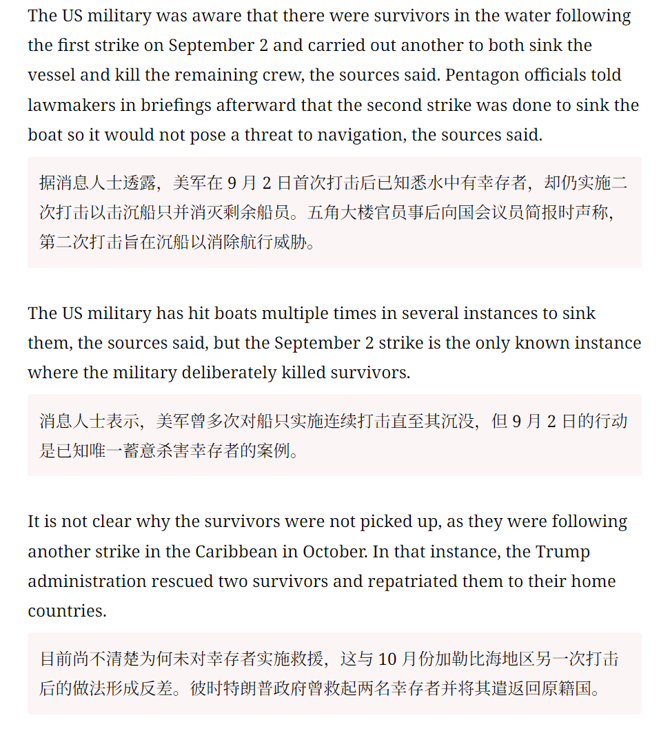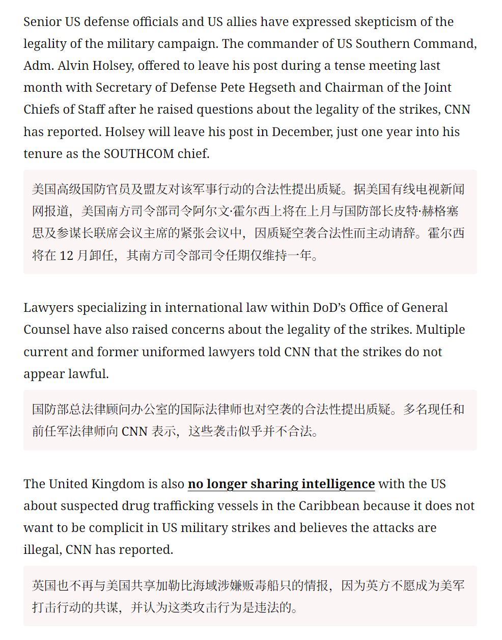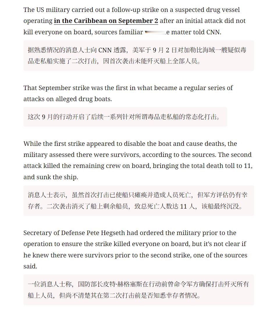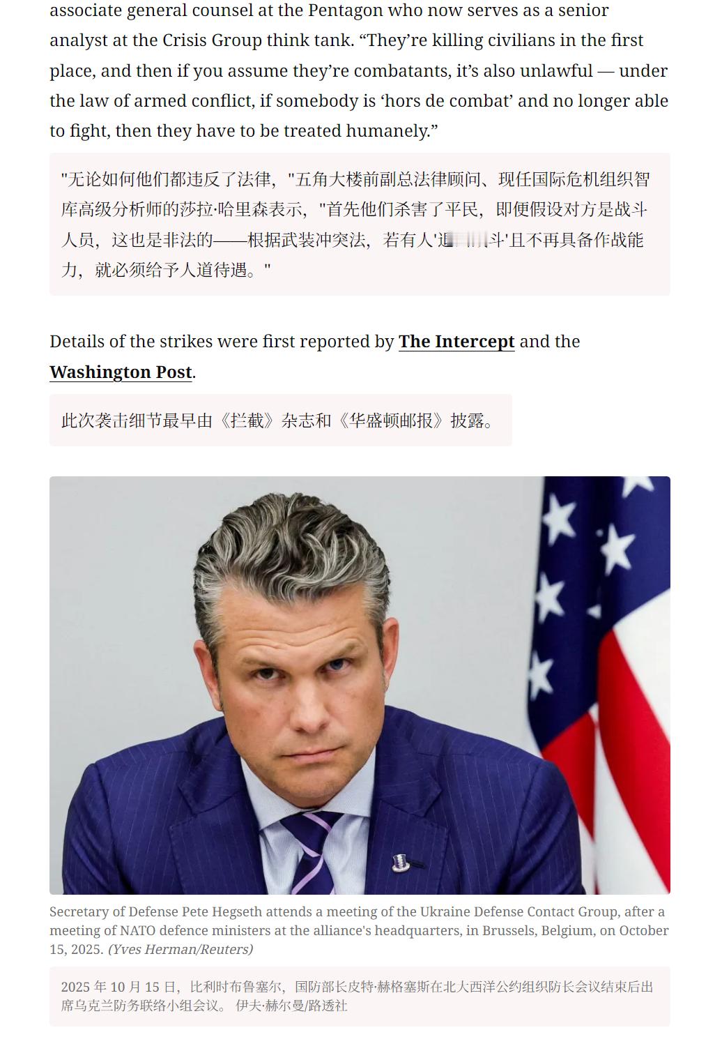 🔻华盛顿邮报、CNN报道:美国战争部长赫格塞斯在 9 月 2 日首次袭击委内瑞拉船只中下令格杀勿论,导致海豹六队主导的行动中又进行了第二轮扫射以消灭水中幸存者。🔻美国官员们承认在船只遭袭前并不清楚船上所有人员的身份。🔻下达"不留活口"的命令可能触犯美国法律红线——美国《武装冲突法》禁止处决已"退出战斗"的敌方作战人员——即因受伤或投降而丧失战斗能力者。🔻据美 CNN 报道,美国南方司令部司令阿尔文·霍尔西上将在上月与赫格塞思及参谋长联席会议主席的紧张会议中,因质疑空袭合法性而主动请辞。霍尔西将在 12 月卸任,其南方司令部司令任期仅维持一年。热点现场 海外新鲜事