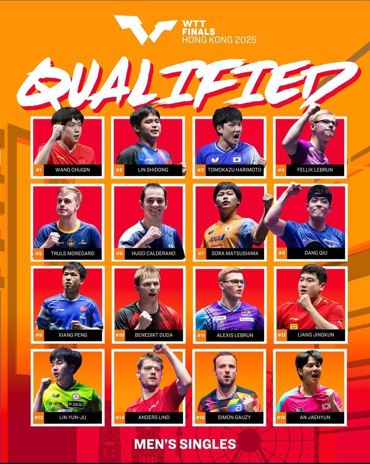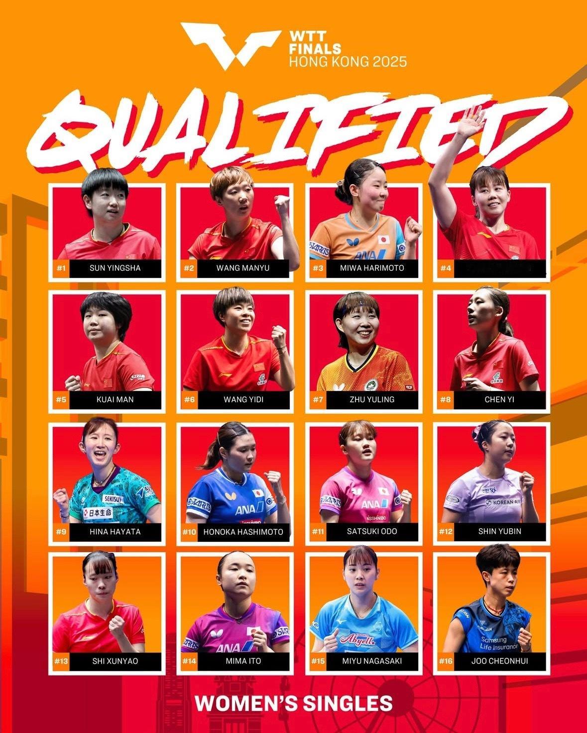 WTT香港总决赛将于12月10日-12月14日在红磡体育馆进行,中国队参赛名单如下:男单:王楚钦、林诗栋、梁靖崑、向鹏女单:孙颖莎、王曼昱、陈幸同、蒯曼、王艺迪、陈熠、石洵瑶混双:林诗栋/蒯曼、王楚钦/孙颖莎(唯一外卡)