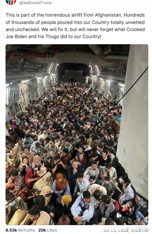 特朗普总统:“这是阿富汗撤离行动中可怕的一部分。成千上万的人未经任何婶查与核实就涌入了我们的国家。我们会解决这个问题,但永远不会忘记“腐败的乔·拜灯”及其同伙对国家所做的事情!”
