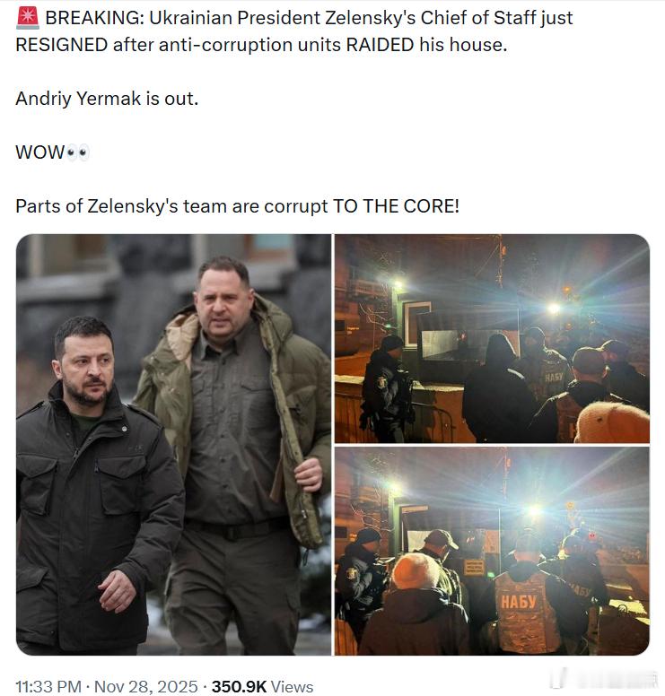 乌克兰总统泽连斯基的幕僚长安德烈·耶尔马克在反腐机构搜查他家后辞职了。泽连斯基团队中的部分人,腐败到了骨子里!
