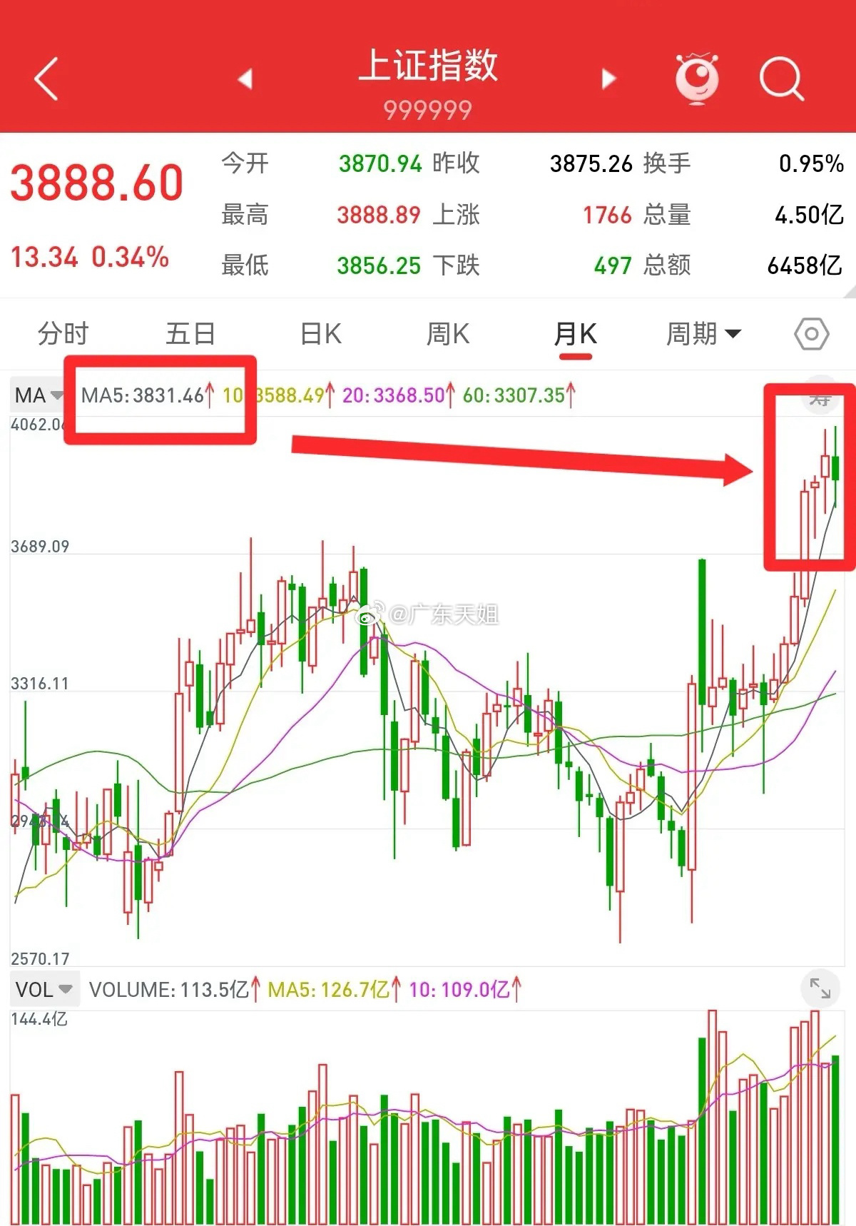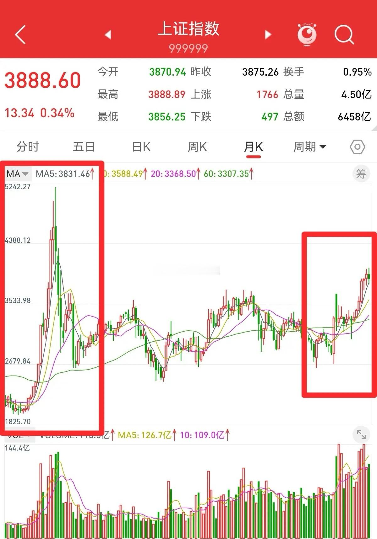11月29日,止步月线六连阳,十一月下跌1.67%,十二月的行情会怎么走?上证指数第一次牛回头,精准回撤到五月均线,十二月会大幅上涨。回顾之前几次牛市行情,每次跌破五月均线之后,上证指数都会开启主升浪。四月初以来,上证指数月线六连阳,沿五月均线稳步攀升,慢牛行情非常明显。截止本周五,五月均线在3831点,十二月会上移到3888点附近,正好与当天收盘点位3888.6重合。2015年牛市,上证指数见顶之前,只有一次跌破五月均线。跌破五月均线39个点,就止跌大幅反弹,开启主升浪。直到5178点见顶,回撤到五月均线以下230点,牛市行情结束。上证指数大幅下跌,最低回调到3816点,跌破五月均线15点,已经回调到位。每一次牛市行情,都会短暂的跌破五月均线,也就是牛回头。之后就会大幅上涨,开启一轮主升浪。如果周末没有利空,十二月上证指数可能大幅上涨,月线再次收中阳线。牛市行情不宜追涨杀跌,躲过下跌,也会错过大涨。最稳妥的选择,就是持有不动,等待行情再次启动。五月均线的支撑较强,上证指数没有大幅下跌的预期,行情非常乐观。上证指数再次大幅上涨,大概率在十二月初,美联储降息之后。祝各位下周好运!