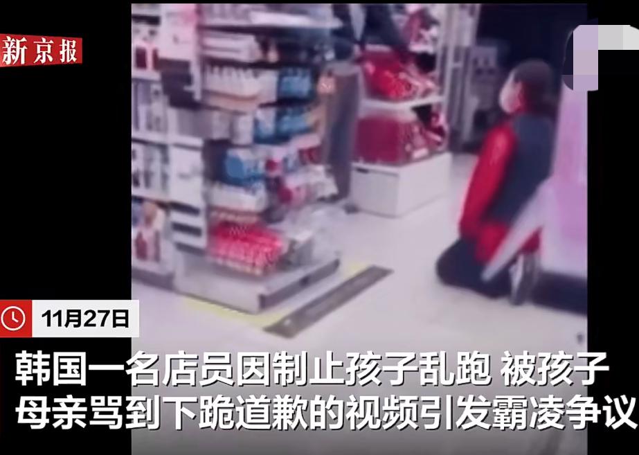 “你算什么东西,我的孩子轮不到你来教训”韩国全罗道南道,店员制止小孩在店里乱跑,被孩子母亲发现后,怒骂店员并威胁要投诉他,店员表示害怕孩子跑来跑去受到伤害才制止的,但是孩子母亲依然不依不饶怒骂店员,店员崩溃跪下求饶,周围顾客纷纷劝阻,视频被发布后网友指责这名母亲霸凌店员
