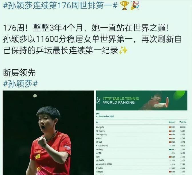 祝贺莎莎世界乒乓球女子单打排名第一,霸榜176周历史第一人!恭喜莎莎实至名归![赞][赞][赞]