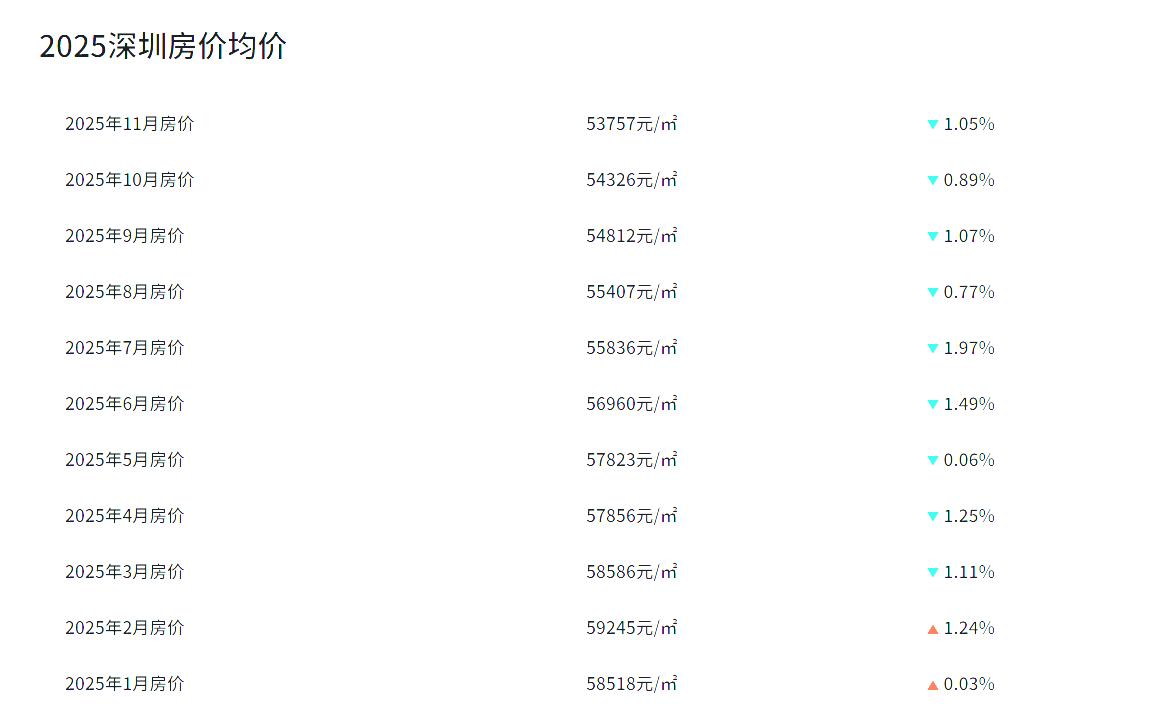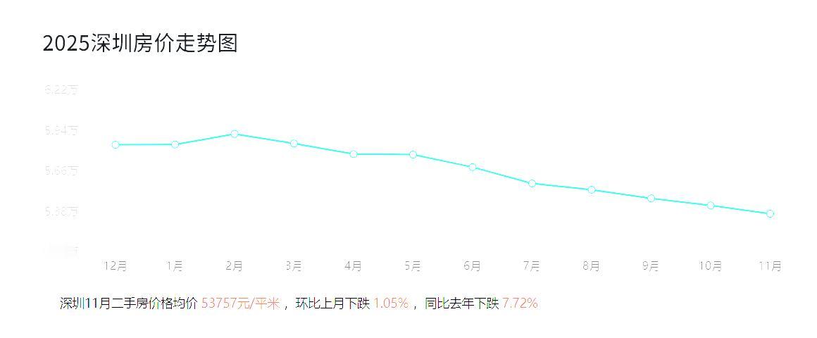 2015年11月,深圳房价均价39451元; 2016年11月,深圳房价均价44982元; 2017年11月,深圳房价均价51277元; 2018年11月,深圳房价均价53716元; 2019年11月,深圳房价均价54709元; 2020年11月,深圳房价均价56600元; 2021年11月,深圳房价均价56913元; 2022年11月,深圳房价均价57456元; 2023年11月,深圳房价均价62237元; 2024年11月,深圳房价均价58256元; 2025年11月,深圳房价均价53757元。 过去十年,深圳房价经历了一轮完整的“暴涨-盘整-回调”周期,形成一条倒U型曲线,2015-2017年是深圳房价的高速增长期,2018年-2022年,房价整体保持平稳,房价在2023年到达顶点后,开始出现小幅回调。2025年房价基本回归208年水平。 深圳房价从启动、繁荣、停滞到衰退,为中国一线城市房地产市场提供了典型案例。深圳作为中国最具创新活力的城市之一,长期来看,房价依然坚挺,但是一定是和经济发展、人口规模等相匹配。