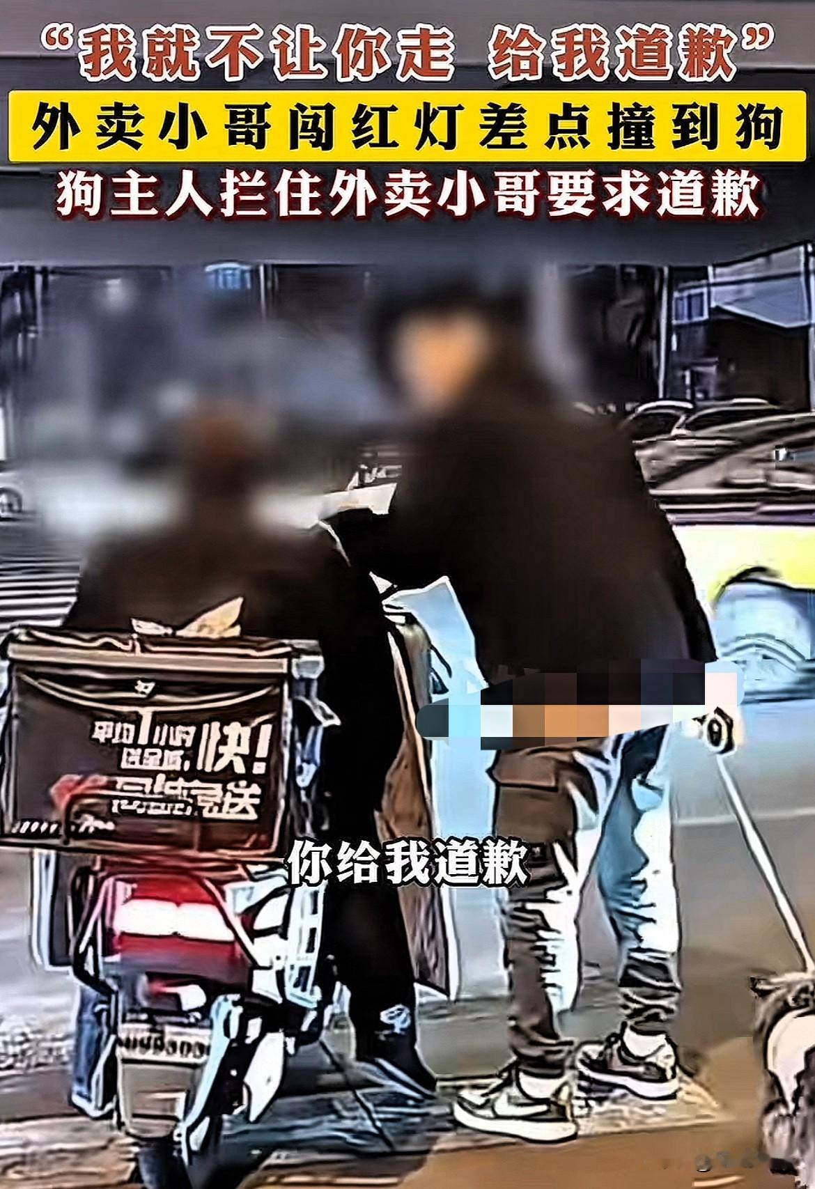 “为这点事值得吗?”北京,男子牵着自己的狗过马路,突然外卖小哥闯红灯差点撞到狗,没道歉就想离开,结果男子怒了:“必须道歉,要不别想走!”然而外卖小哥却拒绝道歉! 男子认为外卖小哥骑车闯红灯,差点压到自己的狗,要求道歉,然而外卖小哥却不愿意,反问男子:“你牵多大的绳啊,我压着它了吗?” 男子怒斥:“你闯红灯过来的,差点碰到,给我道歉!”,男子一边说,一边拦住外卖小哥。 这事也是引起网友热议,有网友说:“闯红灯差点压着人家,就应该道歉,现在送外卖的,该管管了,整天横冲直撞,太危险了!” 然而也有网友说:“差点碰上就是没碰上,这点小事,何必难为人家呢?人家外卖小哥也不容易!” 对于这件事,我认为,送外卖虽然辛苦,也都是为了生活,但是也是遵守交通规矩,毕竟生命只有一次,忽视交通规则,既是对自己生命的不尊重,也是对他人安全和交通秩序的威胁。 俗话说,退一步海阔天空,生活不易,犯了错就应该道歉,还是要多一些理解和包容,大家觉得这个事,到底是谁的错呢? (信息来源:法治进行时)
