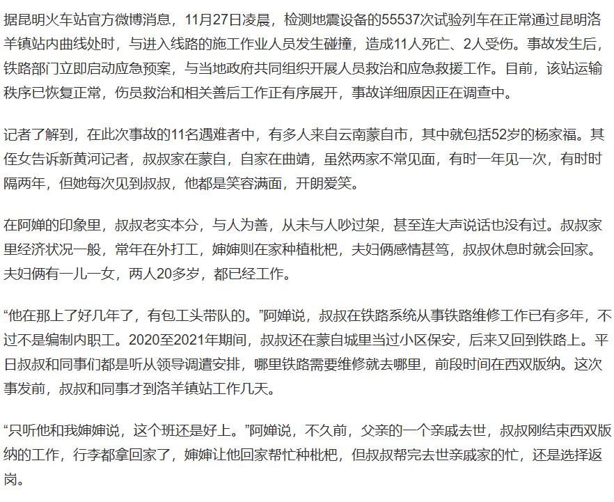 【#昆明火车站事故遇难家属发声#】2025年11月27日凌晨,云南昆明一试验列车发生一起重大碰撞事故致11人死亡、2人受伤。其中,就包括52岁的杨家福。他中等身材,平头、圆脸,看起来比实际年龄小。“事发时,叔叔才刚到洛羊镇站工作几天。”11月28日,杨家福的侄女阿婵告诉新黄河记者,叔叔老实本分,在铁路从事维修工作多年,家庭经济状况一般,但跟婶婶感情甚笃。这次的事故,包括叔叔在内相邻两村的5名蒙自老乡一同罹难。“他在那上了好几年了,有包工头带队的。”阿婵说,叔叔在铁路系统从事铁路维修工作已有多年,不过不是编制内职工。2020至2021年期间,叔叔还在蒙自城里当过小区保安,后来又回到铁路上。平日叔叔和同事们都是听从领导调遣安排,哪里铁路需要维修就去哪里,前段时间在西双版纳。这次事发前,叔叔和同事才到洛羊镇站工作几天。