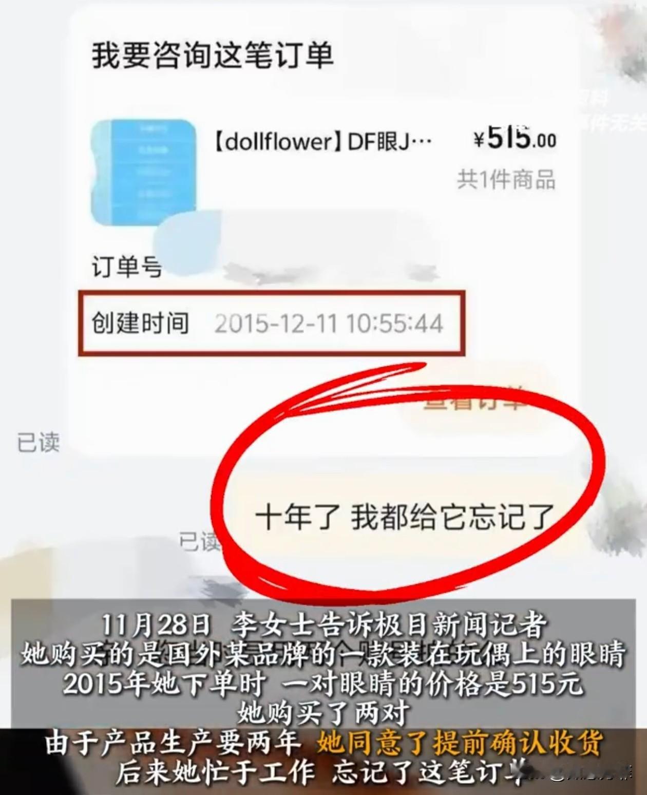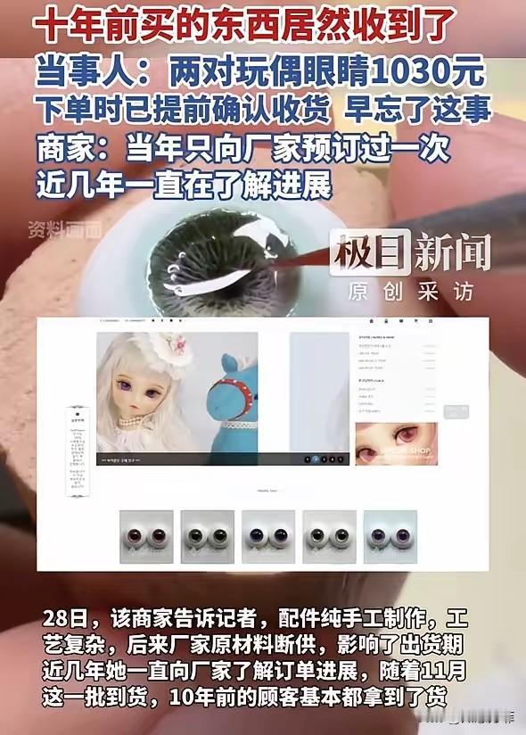 万万没想到!上海,一女子10年前花费1030元买了个手工玩偶的配件,后来因为工作忙,忘了,结果最近收到消息说到货,商家专门发短信提醒。 2015年,女子刚大学毕业,特别喜欢收藏手工玩偶,就花了1030元在网上买了两对国外品牌的手工玩偶眼睛。 当时商家跟她说,这眼睛是国外工匠纯手工做的,工序特别复杂,生产周期得要两年,让她先提前确认收货,女子也爽快答应了。 后来女子工作忙,就慢慢忘记了这笔订单,之后又搬了家,连当初要配眼睛的玩偶都陆续卖掉了,只有手机号码一直没换。 而商家这边,本来承诺两年交货,结果2017年国外厂家突然遭遇原材料断供,又因为市场变化,早就不代理这个玩偶品牌了,但商家一直没忘记这批未发货的订单。 今年11月,这批拖了十年的玩偶眼睛终于做好到货了,商家整理了联系方式,给女子发了到货短信。 女子收到包裹,拆开一看,除了当初买的两对,商家还额外送了一对,附的小卡片写着感谢十年等待,致歉延迟发货。当年下单的大部分顾客也都收到了货。 商家很守信用,在快节奏的当下,能坚持十年兑现承诺,真的太难得了。