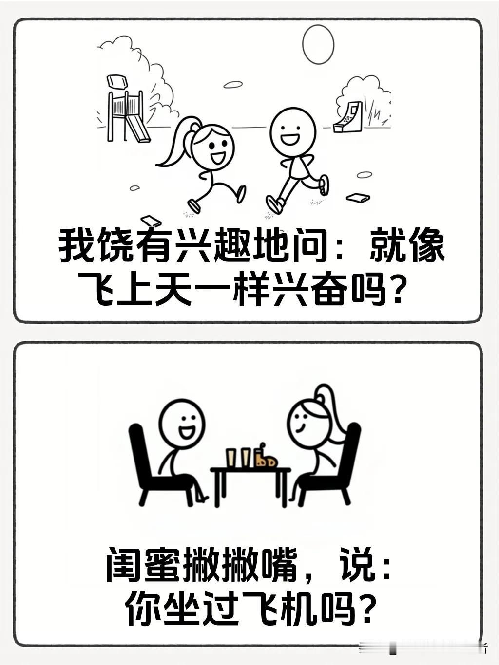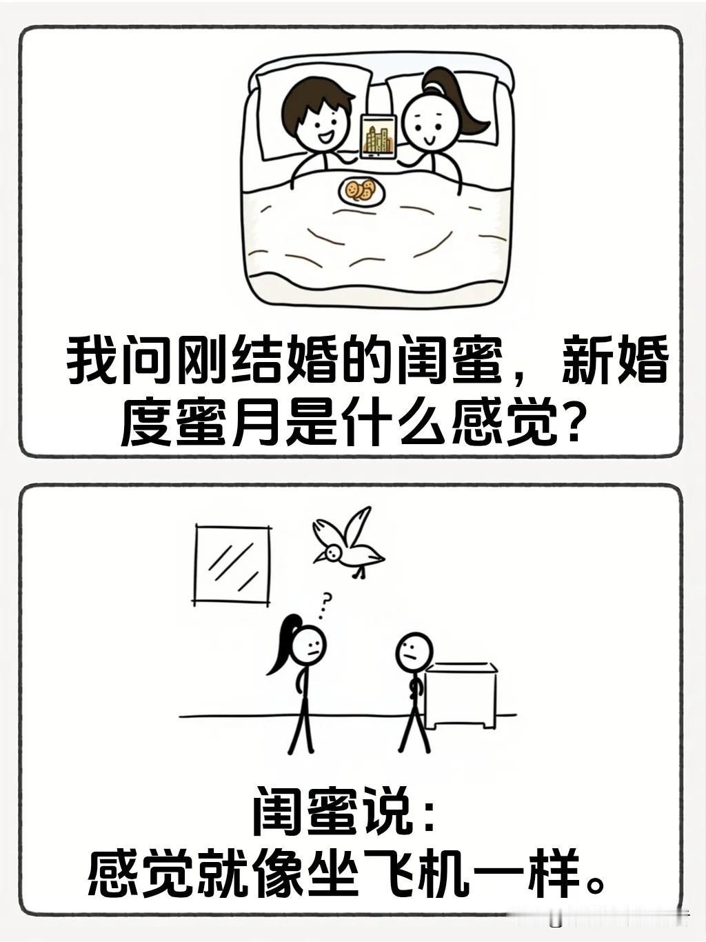趣味漫画:我问刚结婚的闺蜜,新婚度蜜月是什么感觉?闺蜜说:感觉就像坐飞机一样。我饶有兴趣地问:就像飞上天一样兴奋吗?闺蜜撇撇嘴,说…
