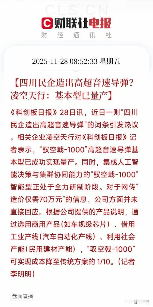 中国民企实在太强了,最近外媒报道,中国民企已经量产高超音速导弹。这家企业就是位于四川的凌空飞行,太强大了,这家企业表示,他们已经生产出了射程高达1300km的导弹,而且导弹的成本只要原来的1/10,看来应该非常的便宜而且集人工智能和协同作战的导弹正在全力的研发当中,这实在是太酷了,一家民营企业都能如此有战斗力,这些导弹最终都卖给谁了呢?谁会从民营企业购买导弹呢!