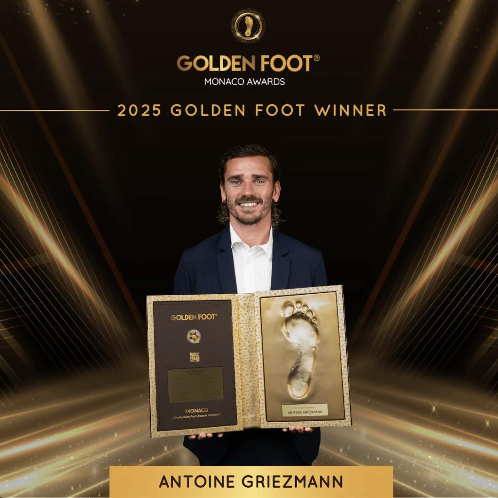 格列兹曼荣膺金足奖 北京时间11月28日,金足奖官方宣布,目前效力于马德里竞技的法国前锋格列兹曼获得2025年金足奖。2003年,金足奖在摩纳哥亲王阿尔贝二世的支持下诞生。金足奖每年颁发一次(2023年停办一次),候选球员必须年满27岁且个人表现和团队表现都需要足够突出。该奖项旨在表彰球员取得的成绩、个人品德和公众及专家的尊重。该奖项的获得者可以在摩纳哥的“冠军大道”上留下自己的脚印,且所有球员一生只能获奖一次。