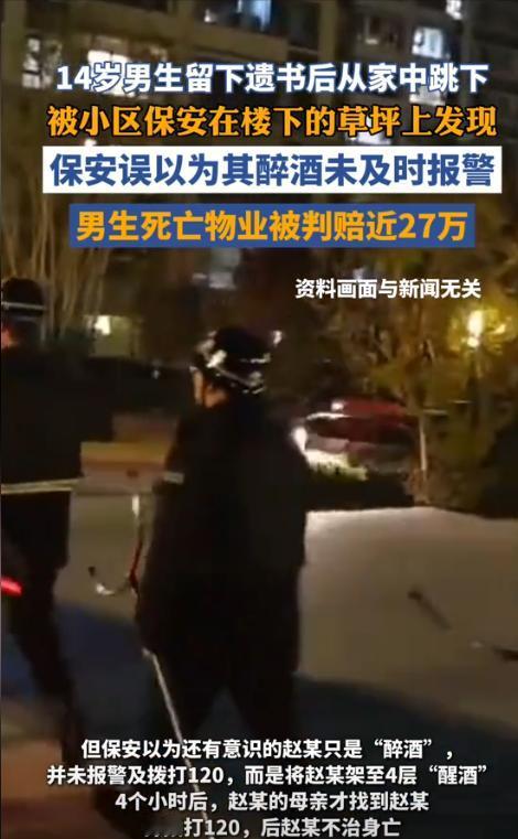 河南许昌,一14岁男生给父母留下遗书后从10楼家中跳下,摔在草坪上后没有当场死亡。有保安经过此处时,看到了男生但误认为男生是喝多了,所以询问了对方家庭住址,但保安把10楼听成了4楼,于是将其放在4楼门口后就离开了。 错把“求救”当“宿醉”,那一念之差,竟然隔绝了生与死的距离。 在那片位于河南许昌小区的草坪上,当保安的手电筒光束晃过少年赵某的脸庞时,谁也没想到,这个14岁孩子的生命倒计时已经悄然开启。 那是去年11月的一个傍晚,大概六点左右,初冬的天色暗得早,巡逻的保安孙某和李某注意到了瘫倒在地上的男孩。在常人的认知里,那个时间点、那个姿势,再加上少年混沌不清的意识,很容易被贴上“贪杯喝高了”的标签。 就是这个先入为主的判断,让随后的所有施救动作都变成了一种充满讽刺的“错误”。当时孩子确实还有意识,能勉强回话,但身体早已软得站不起来。 保安出于职责多问了几句,得到的反馈是含糊其辞的“5号楼2单元”。关键的分歧出在楼层上——孩子嘴里努力挤出的也许是自家的“1001”,但在保安耳中,那串数字变成了“401”。 如果当时有人能更警觉一点,或许就能发现事情的端倪。毕竟,一个2010年出生、才刚上初中的孩子,怎么会无缘无故烂醉在自家楼下? 遗憾的是,两位保安在简单确认对方“不需要110或120”后,便选择了最省事也最符合常理的处理方式:两人架着孩子进了电梯,要把这个“醉酒少年”送回他口中的那个家。 这一送,就把生的希望彻底送断了。他们将已经无法自立的赵某放在了401室门口的过道里,转身离开。在那冰冷的楼道间,生命体征正一点点从少年身上流逝。 而真相是残酷的:这根本不是什么青春期的叛逆买醉,而是一场因为学业压力引发的悲剧。这天下午,赵某在与父母争执后写下遗书,趁人不备从10楼家中一跃而下。但他并没有当场殒命,而是坠落到了楼下草坪。那瘫软的身躯不是酒精麻痹,而是坠楼后的重创。 整整四个小时的黄金抢救期,就被这样不可思议地荒废在了4楼的走廊里。直到当晚九点半左右,焦急万分的母亲才终于在错误的楼层找到了奄奄一息的儿子。 然而一切都太晚了,9点50分急救车呼啸而来,换来的却是之后医院一纸冷冰冰的宣告:22点54分,抢救无效死亡。 这起悲剧在法庭上引发了极大的争议,焦点的核心在于“死因”与“责任”的拉扯。物业方觉得冤枉,他们认为孩子自己留遗书轻生是主因,而且保安当时已经尽到了询问义务,是孩子自己拒绝了报警和急救,况且嘴里说着不清不楚的楼层号,听错了怎么能怪保安? 但法律的视角显然更加严谨且充满了人道主义考量。虽然赵某的父母出于情感原因坚决反对尸体解剖,导致无法从医学上精准界定直接死因,从而在一审中被认定因监护缺失及放弃鉴定理应承担主要责任,但这并不意味着物业可以全身而退。 法院的审理撕开了“尽职”背后的冷漠:面对一个躺在公共区域草坪上、显然已经失去行动能力的未成年人,保安的管理职责绝不仅仅是“听他说不需要就不管”。 把人扔在半路这种行为,无论如何都算不上合理的救助。《民法典》的侵权责任条款和《物业管理条例》中关于安全防范的规定,成了二审维持原判的坚实依据。 那个把10楼听成4楼的失误,不仅仅是听觉的偏差,更是职业敏感度的缺失。法院认定,虽然坠楼是自杀行为所致,但保安将人误放在4楼长达数小时,确实构成了协助救助不力,客观上贻误了抢救时机。 最终,近27万元的赔偿金(含1.5万元精神抚慰金),成了物业必须为这份“粗心”付出的代价。但这笔钱,终究换不回那个曾在草坪上挣扎喘息的年轻生命。 信息来源:14岁男生从10楼坠楼,保安误以为其醉酒未及时报警,男生死亡物业被判赔近27万 2025-11-28 09:51·大河报