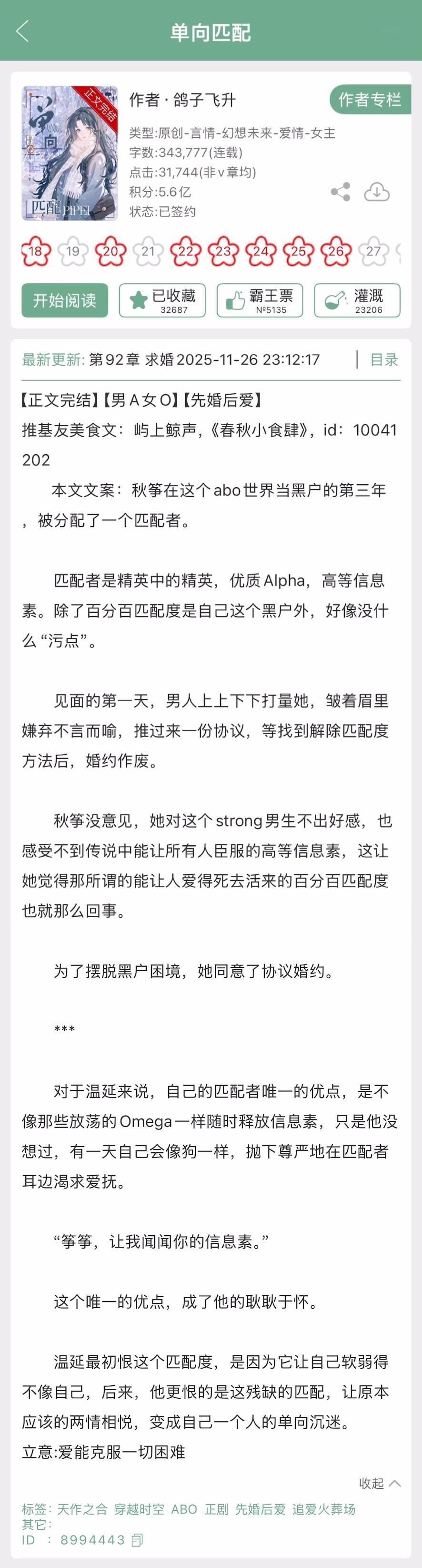 鸽子飞升的《单向匹配》完结啦!ABO➕先婚后爱