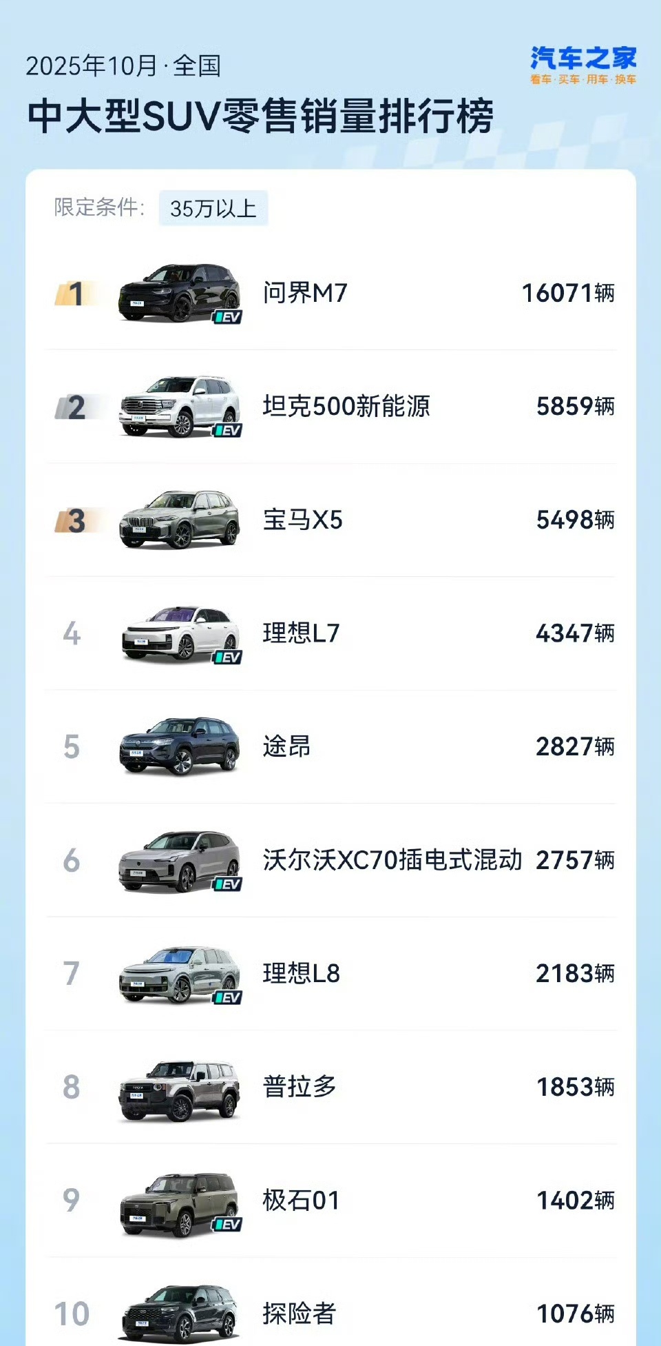 问界M7成35万级中大型SUV销冠35万级中大型SUV销冠落问界M7,销量碾压同级竞品,既赢了新能源对手也赛过传统豪华车,靠科技平权和实用配置站稳高端市场,国货实力肉眼可见!