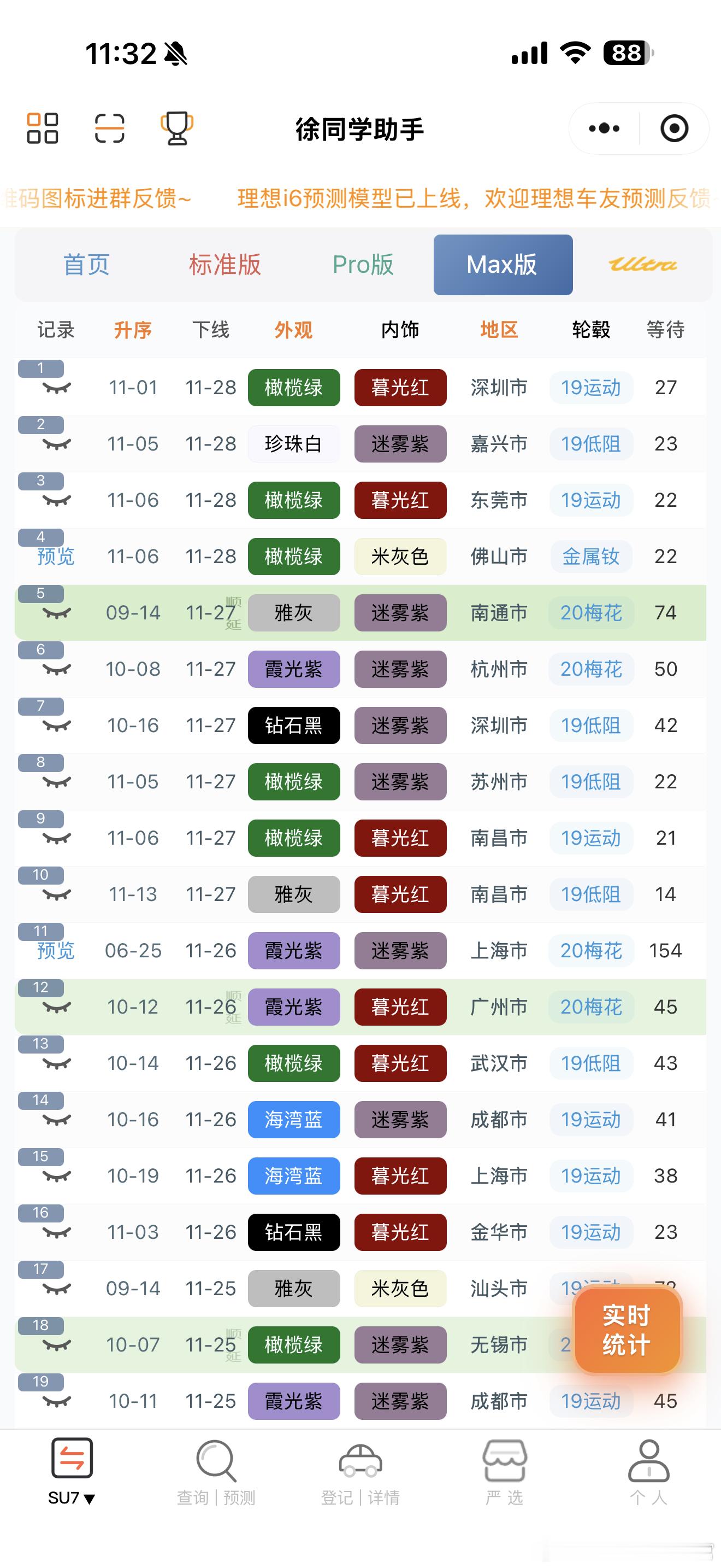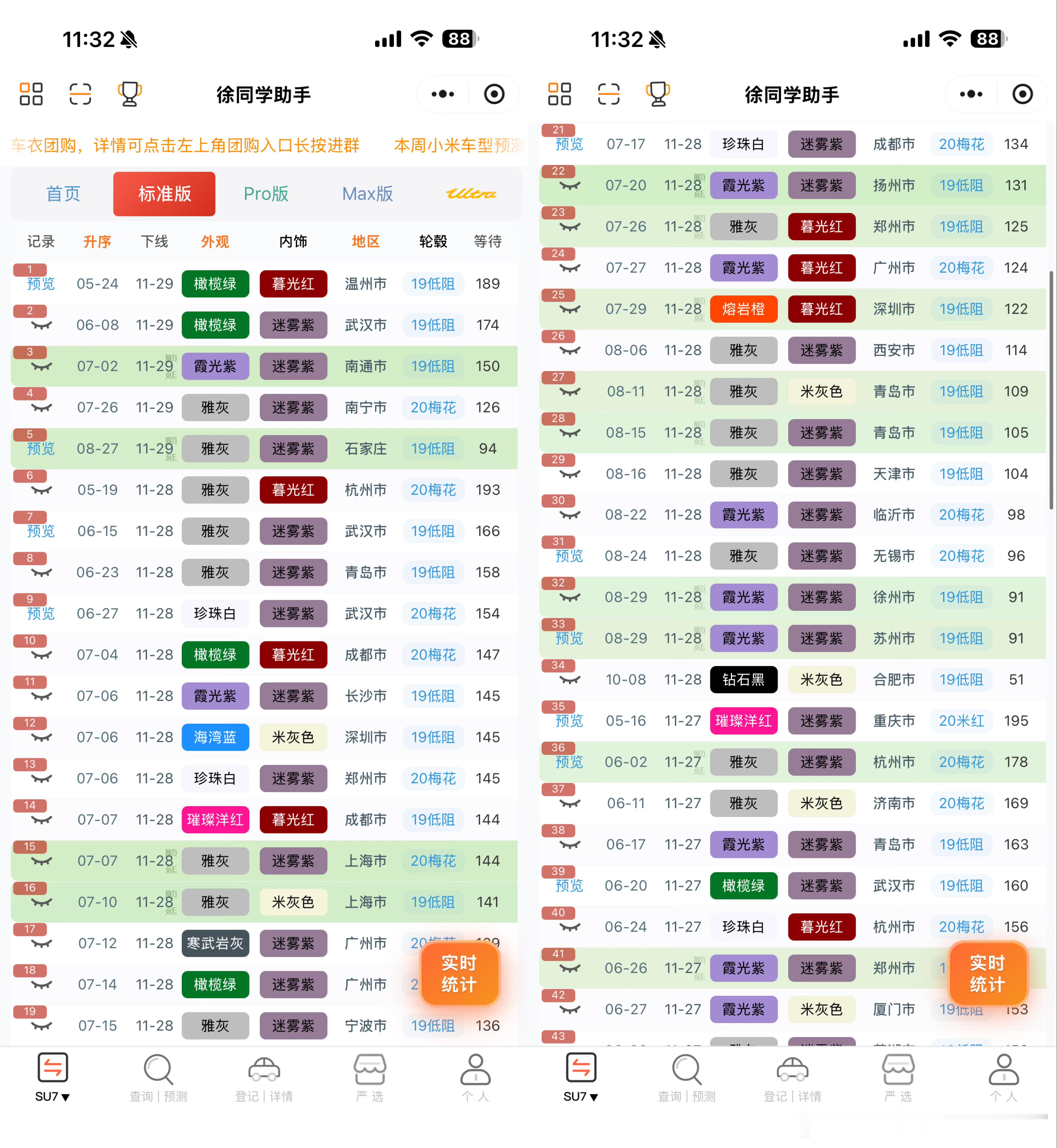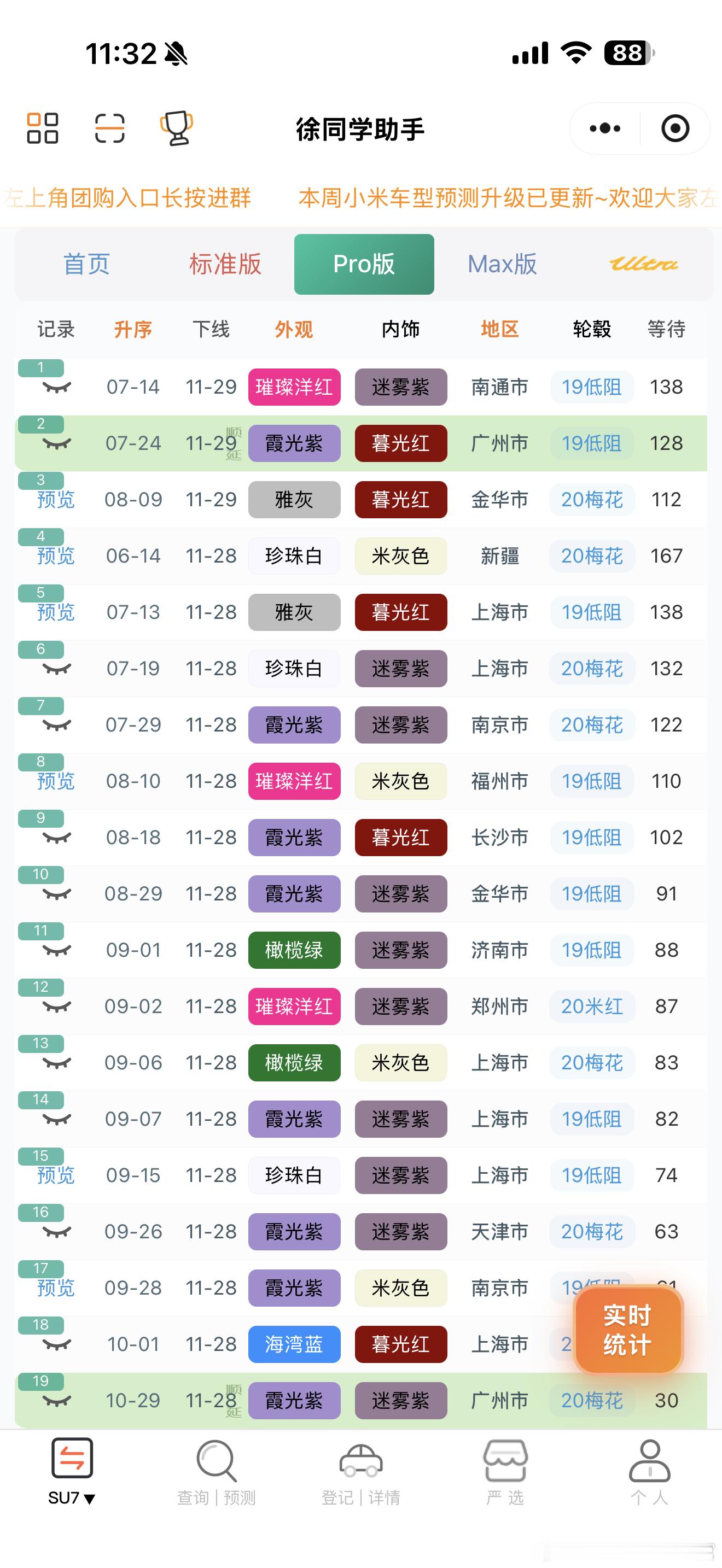 小米汽车(11月29日)下线实况月底顺延量很大,这个周末正式冲刺交付量的时候。交付中心的车非常多,前两天下线的终于运过来了🌀YU7(据不完全统计)合计131台1️⃣标准:下线54台,剩下的24周左右的终于动了,大部队下线都是顺延30周以后的2️⃣Pro:下线43台,大部队都是顺延的30周以后的了3️⃣Max:下线34台,下线进度相对比较理性,没有出现其他版本的夸张顺延,7月初的随时在下了🌀SU7(据不完全统计)合计49台1️⃣标准:下线29台,7月份的下线居多,6月剩的不多了2️⃣Pro:下线16台,9月份的随时下线,还是有人在新订车的3️⃣Max:下线4台,基本没啥车了4️⃣ultra:无更多关于小米汽车的最新资讯和深度解析,请参考【米车派】~徐同学助手小米汽车