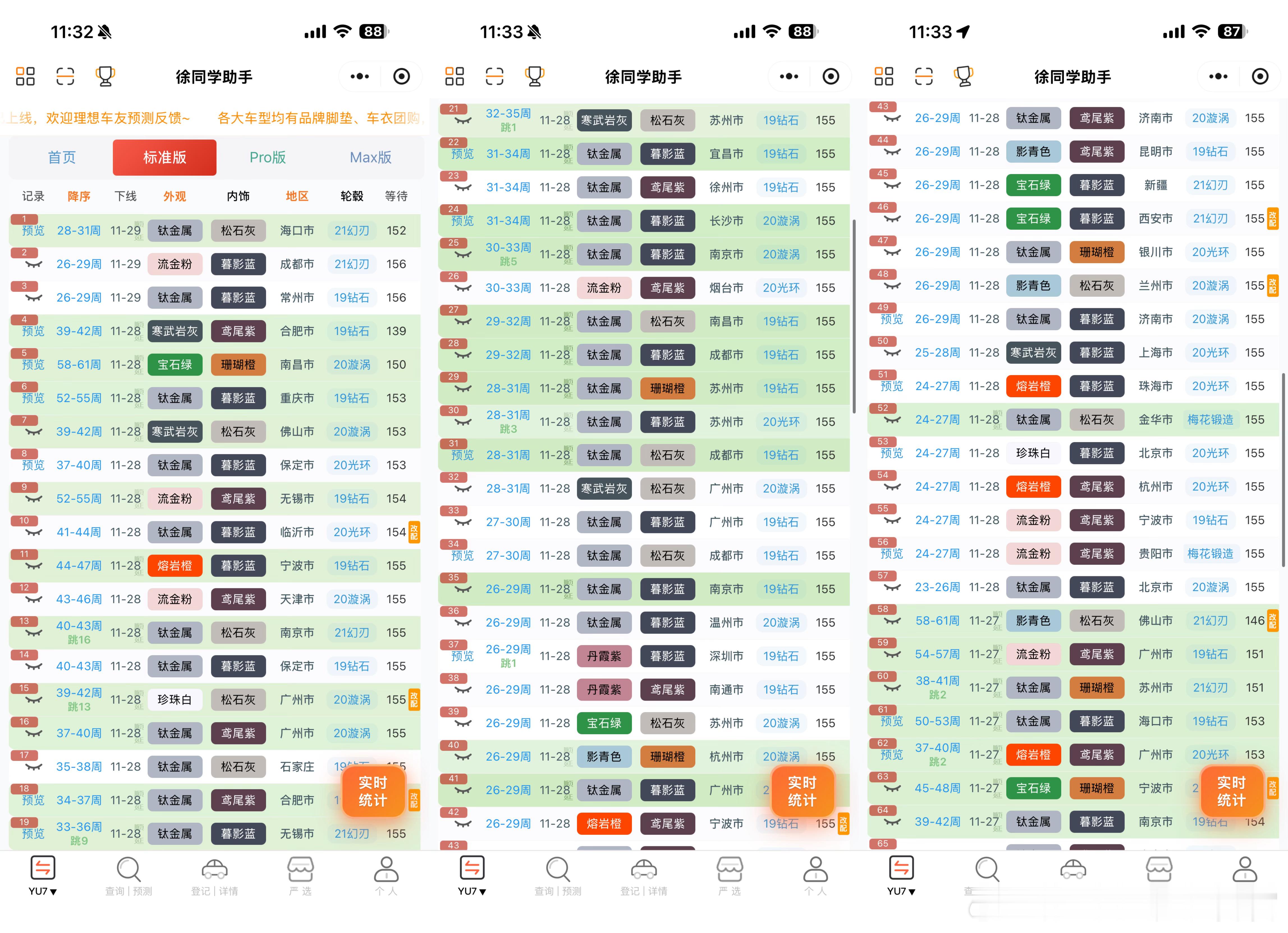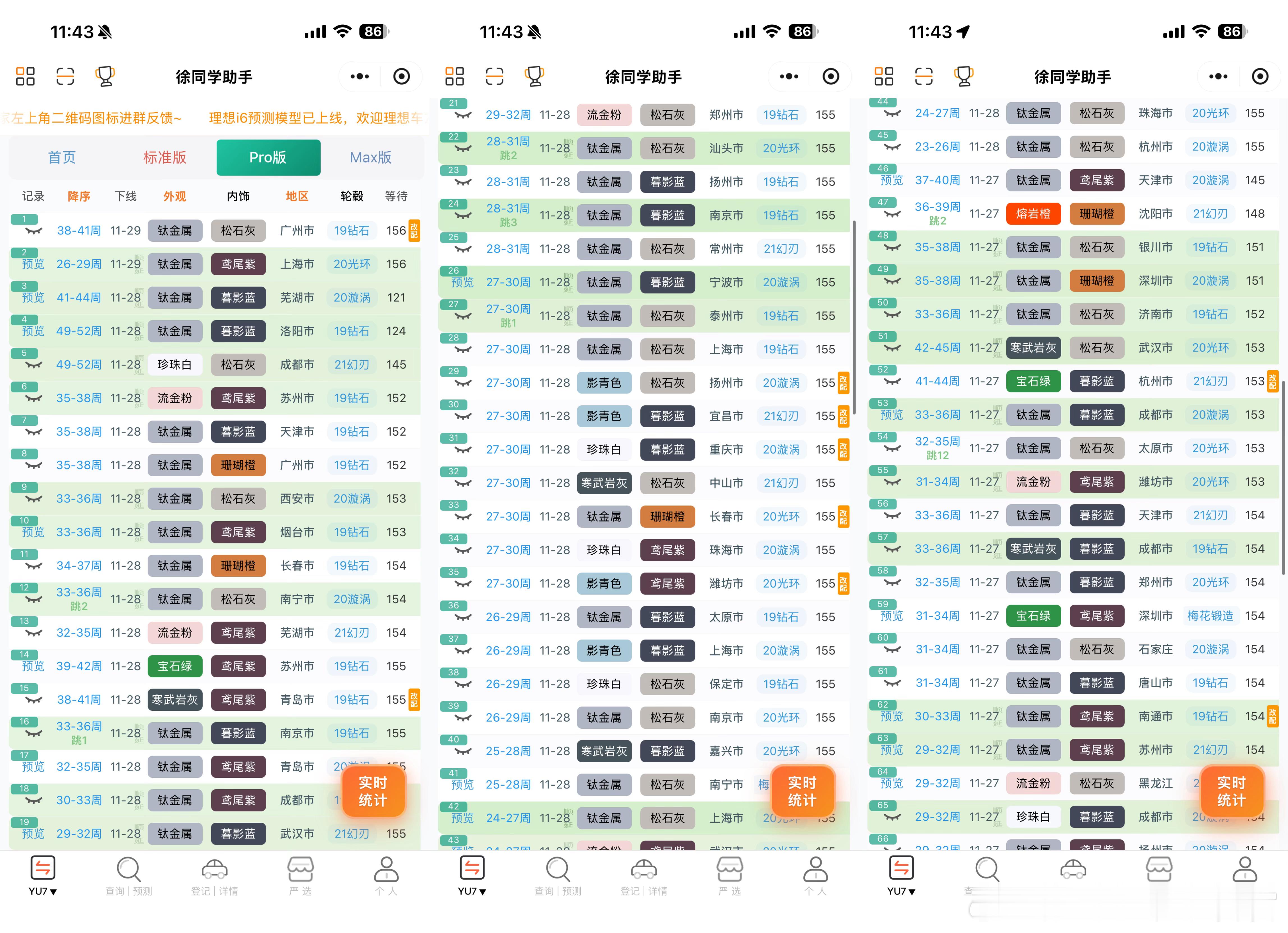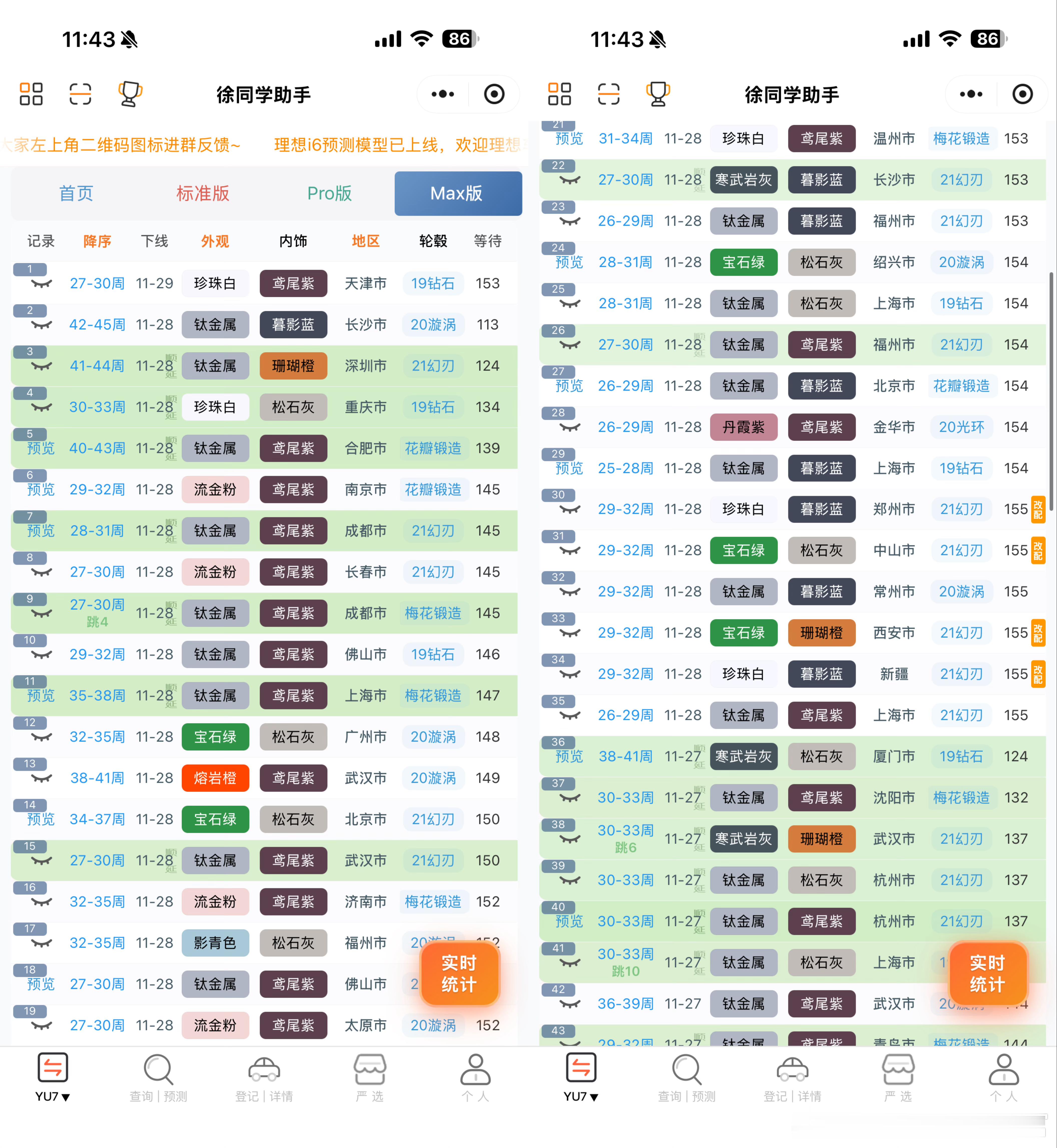 小米汽车(11月29日)下线实况月底顺延量很大,这个周末正式冲刺交付量的时候。交付中心的车非常多,前两天下线的终于运过来了🌀YU7(据不完全统计)合计131台1️⃣标准:下线54台,剩下的24周左右的终于动了,大部队下线都是顺延30周以后的2️⃣Pro:下线43台,大部队都是顺延的30周以后的了3️⃣Max:下线34台,下线进度相对比较理性,没有出现其他版本的夸张顺延,7月初的随时在下了🌀SU7(据不完全统计)合计49台1️⃣标准:下线29台,7月份的下线居多,6月剩的不多了2️⃣Pro:下线16台,9月份的随时下线,还是有人在新订车的3️⃣Max:下线4台,基本没啥车了4️⃣ultra:无更多关于小米汽车的最新资讯和深度解析,请参考【米车派】~徐同学助手小米汽车