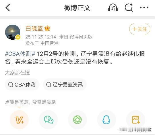媒体人白晓篮:辽宁男篮没有给赵继伟报名12月2号的补测,可能伤病还没有恢复。 不参加补测,这就意味着赵继伟将会缺俱乐部杯和CBA新赛季部分的比赛,赵继伟的受伤真的不是时候,对辽篮和国家队都是一种损失,如果昨晚对韩国有赵继伟的话,中国男篮不会打得那么困难,结果也不会是这样的,赵睿受伤缺席就需要赵继伟的组织串联,他适合与周琦和胡金秋的一五挡拆战术,也只有赵继伟才能激活周琦和大秋在内线的作用