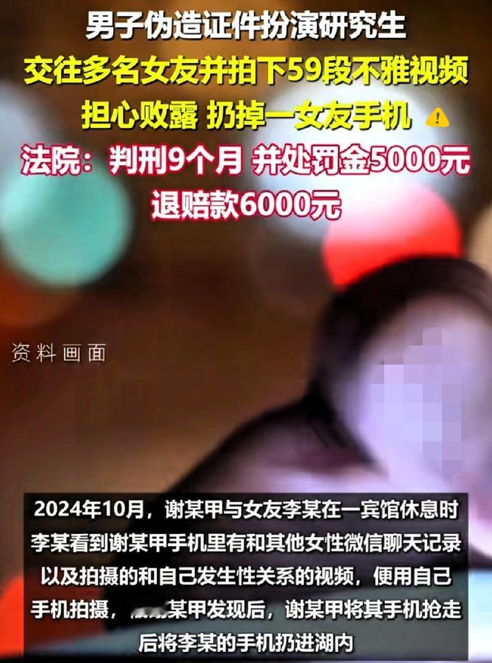 网恋男友的手机里,藏着59个女孩的噩梦 河南濮阳这事儿真的越想越气,22岁姑娘网恋遇上个“伪学霸”,对方伪造身份证装00后研究生,甜言蜜语骗到同居,结果姑娘偶然翻他手机,竟看到自己被偷拍的不雅视频,往下滑更惊悚,里面足足存着59段不同女生的同类视频。 姑娘急着拍证据,手机直接被男方抢去扔进湖里销毁,还好她果断报警,才揭穿这人的真面目—— 根本不是什么研究生,就是个专骗女生、偷拍炫耀的渣男,最终被判了9个月牢。 可法律的惩罚再狠,也抹不去那些女孩被侵犯隐私的创伤。 这哪儿是谈恋爱,分明是踩进了精心布下的陷阱。 网上交友最该防的,从来不是不够合拍,而是披着温柔外衣的恶意算计。 真心从来换不来假意,唯有守住警惕心、敢用法律维权,才不会让真心被糟蹋。 你身边有人遇过这种伪装的渣男吗?