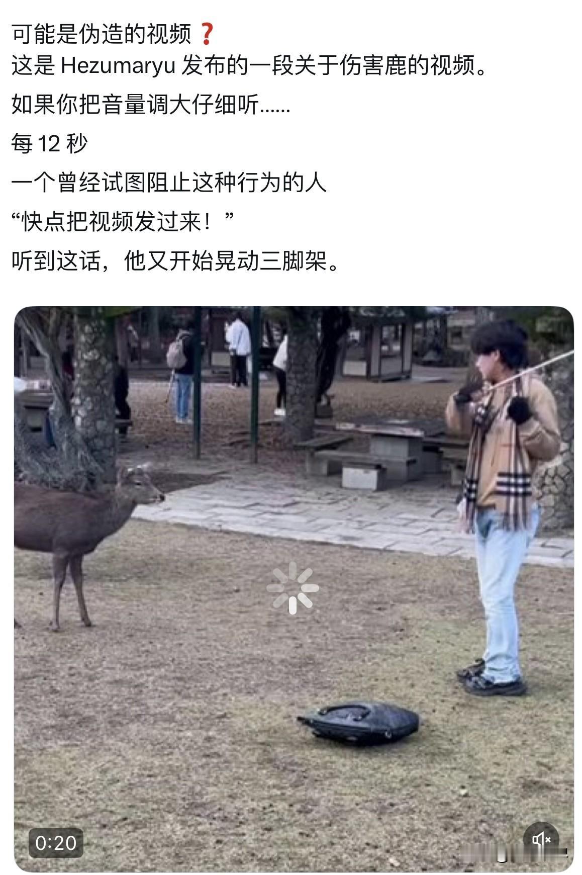 11月下旬以来,日本网络上流行的一段视频,内容是一位疑似中国游客在奈良公园使用自拍杆击打或驱赶当地梅花鹿的画面。该视频由日本网红原田将大发布的。视频迅速走红,浏览量超过250万,转发超1.6万,引发大量讨论和争议。 有日本人仔细研究了该视频,认为是伪造的。原因在于视频第十二秒,可以清晰听到“快拍视频”的日语。这份视频不排除是有意造假摆拍,然后由原田栽赃中国人。日本还是有良心尚存的民众。 日本网红原田将大以此类“护鹿”视频博取流量,已多次造假针对中国游客制造舆论。其心可诛,非常恶劣。