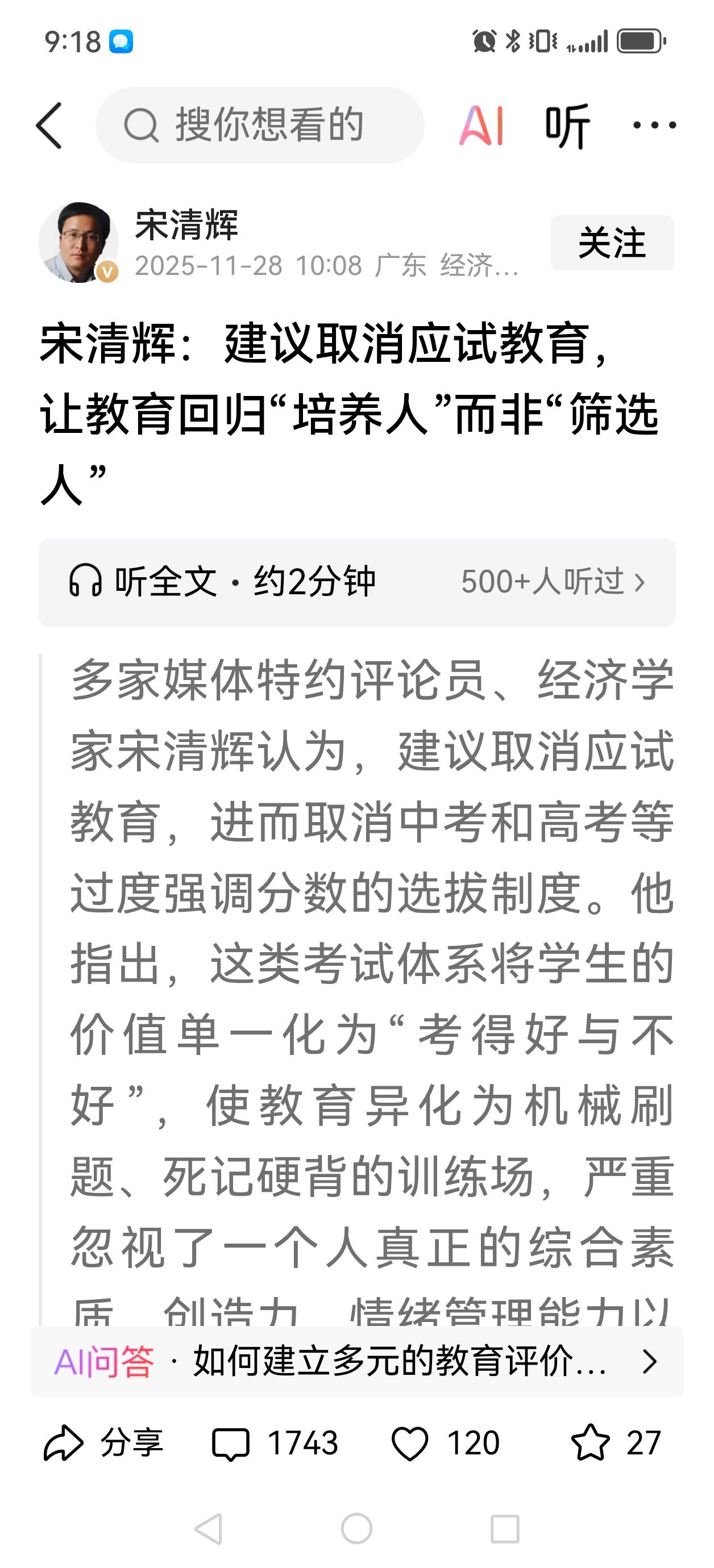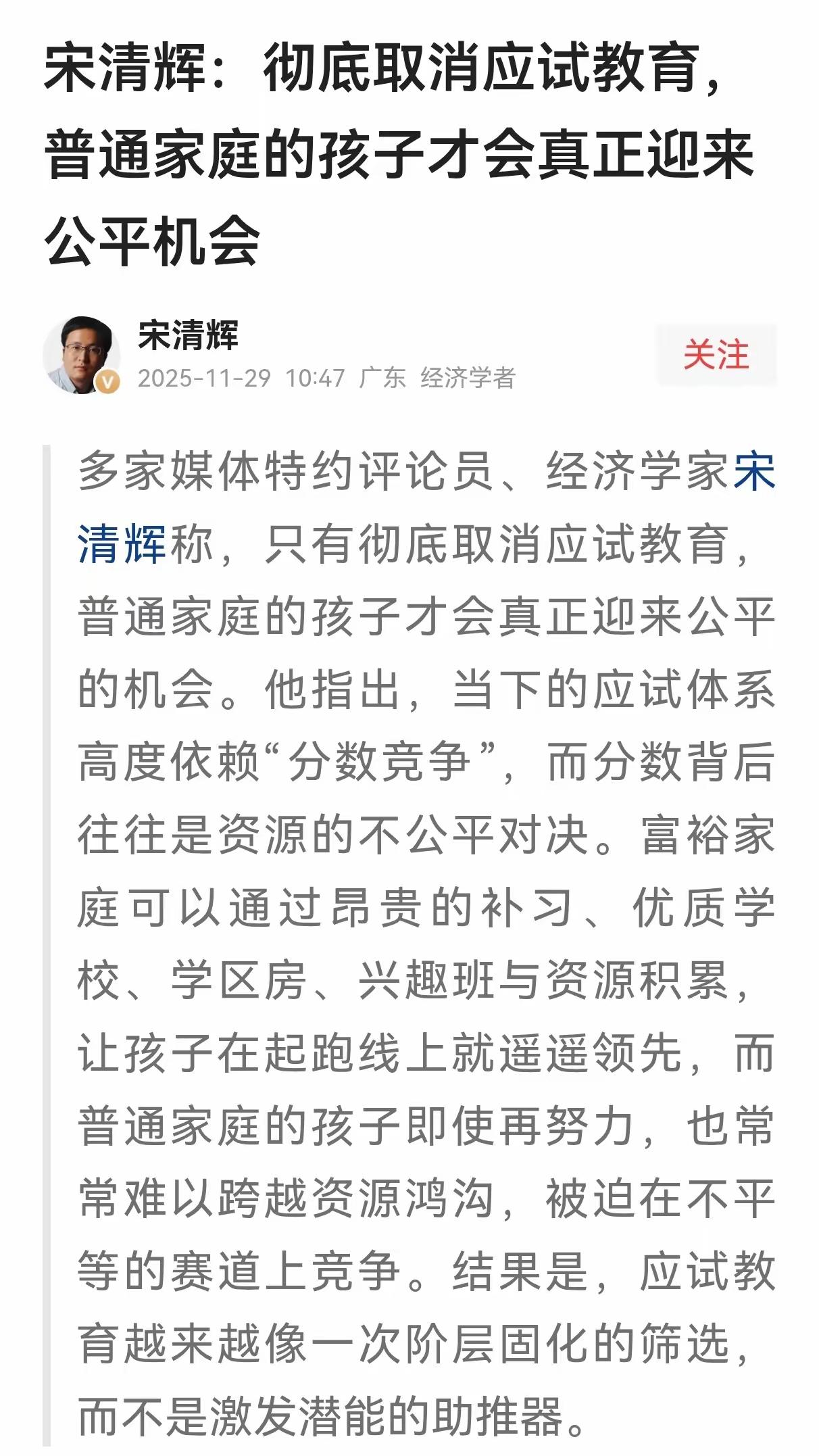 取消考试,普通家庭的孩子将难有出头日。 网红经济学家宋清辉又对教育指手画脚,提出“彻底取消应试教育”,认为这样“普通家庭的孩子才会真正迎来公平的机会”。 您认同吗? 只想问宋先生两个简单的问题: 一,不用考试,由谁来决定上大学的名单? 二,废除“逢进必考”,公务员,军官,医生,教师,警察,包括各级央企国企的管理干部的选拔,由谁说了算? 宋先生,请回答!