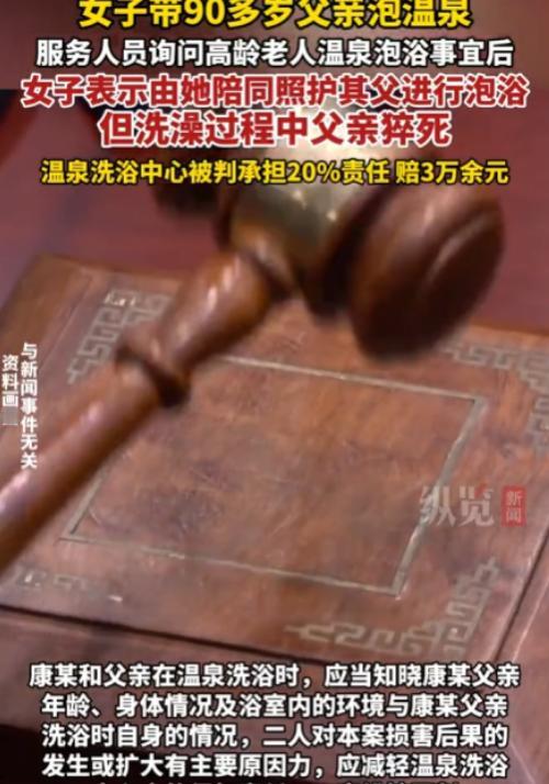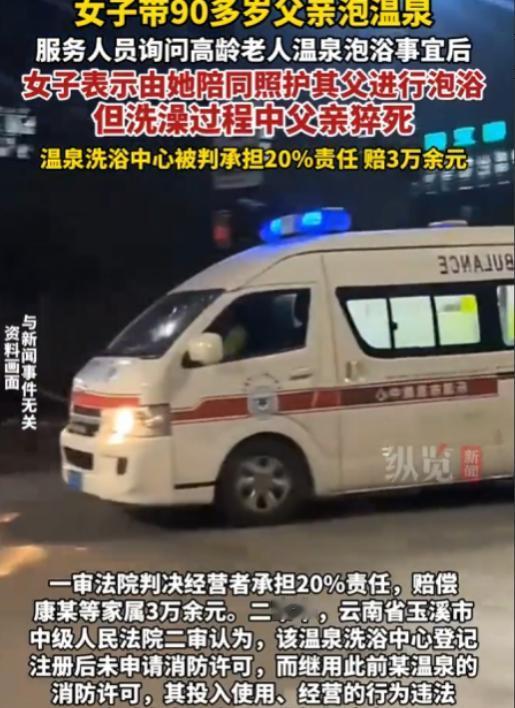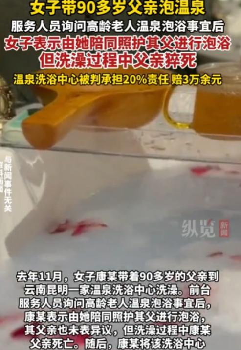 云南昆明,女子带90多岁的父亲到温泉洗浴中心泡澡,买票前,女子明确表示,她会全程陪同并照顾父亲。谁知,进去没多久,老人就出意外,尽管工作人员第一时间拨打了急救电话,但老人还是不幸去世。女子认为,父亲的悲剧洗浴中心应该负责,便将店家告上法庭,要求赔偿。洗浴中心觉得很冤枉,但法院的判决让人意外。   2024年11月23日下午,昆明的寒意被温泉浴场的水汽揉得发暖。   92岁的张大爷被女儿康某扶着走进更衣室,老式牛皮鞋蹭过门口卷边的防滑垫,发出“刺啦”一声轻响。   爸,就泡5分钟,适应下就出来,康某选了最靠门的浅水区,水温调到38℃,比家里泡脚的温度还低两度。   她先让父亲坐在池边的台阶上,用温水泼了泼老人的小腿,每隔3分钟就问一次“头晕不晕”。   可就在第十一分钟,张大爷突然身子一歪,头重重磕在池沿,脸色瞬间从红润变得惨白,康某的尖叫刺破了浴场的轻音乐,她伸手去扶时,老人的手臂已经软了。   监控画面显示,三名员工几乎是闻声奔来,最快的那个小伙子甚至摔了一跤,有人立刻跪在地上做胸外按压,有人飞奔去拿急救箱,还有人边跑边打120。   胸外按压的动作还算标准,可当员工翻出急救箱里的硝酸甘油时,才发现药盒上的有效期停留在2024年5月。   120赶到时,老人已经没有了生命体征,公安尸检报告最终认定为“心源性猝死,排除外力伤害”。   悲痛过后,康某找到了李老板,我爸是在你们这儿没的,防滑垫卷边、急救药过期,这些安全隐患不是口头提醒就能抵消的!   康某的声音带着哭腔,她无法接受“尽孝之旅”变成永别,可李老板更委屈,我们提前就跟你说高龄泡温泉有风险,你拍着胸脯保证会盯着,出事我们也没耽误急救,凭什么要担责?   协商崩裂后,康某一纸诉状将浴场告上法庭,索赔18万余元,这场官司的核心,在法官敲下法槌时终于浮出水面。   法院调查发现,李老板的浴场2023年接手后,一直沿用前店主的消防许可证,压根没按新规重新申报.   除了防滑垫和急救药的问题,浴场的高温区没有设置“高龄禁入”标识,也没配备专门的体温监测设备。   口头提醒和事后急救,不能抵消事前违法经营的根本过错,主审法官在庭审时的话,点破了关键。   同时,法院也明确了康某父女的责任,张大爷虽已92岁,但意识清醒、能自主表达意愿,作为完全民事行为能力人,应对高龄泡温泉的风险有基本认知.   康某作为陪同者,既没提前带父亲做健康检查,也没要求浴场提供更细致的保护措施,对风险预判不足。   最终,20%与80%的责任划分,成了“违法过错”与“风险疏忽”的精准匹配,浴场不服上诉,二审法院维持原判。   高龄老人泡温泉的安全流程,应该包括提前测血压、水温不超37℃、每5分钟出水休息,可多数小型浴场连基础的水温分区都做不到。   康某后来也后悔,要是提前问下医生,要是多留意下浴场的设施,我爸可能还在……”   这场悲剧最令人唏嘘的,是没有真正的“坏人”,康女士想给父亲尽孝,李老板想好好做生意,却都栽在了“侥幸”里。   康女士觉得“自己盯着就万无一失”,李老板觉得“提醒过就万事大吉”,可安全从来容不得半点侥幸.   卷边的防滑垫、过期的急救药、没更新的许可证,这些被忽视的细节,最终织成了悲剧的网。   二审判决书的末尾,有句话戳中了所有人,生命安全的保障,从来不是法庭上的唇枪舌剑,而是每个细节里的未雨绸缪。   康某失去父亲的痛苦,李老板承担赔偿的委屈,本质上都是“事前防范缺失”的代价。   当我们纠结“谁该担责”时,更该想“如何不发生”。商家多一次设备检修,少一分证件侥幸;消费者多一次风险咨询,少一分主观臆断;监管多一次合规检查,少一分放任自流。   毕竟,无论是开门迎客还是陪伴家人,安全从来不是“事后追责”的选择题,而是“事前设防”的必答题,这道题,答错一次就可能无法挽回。