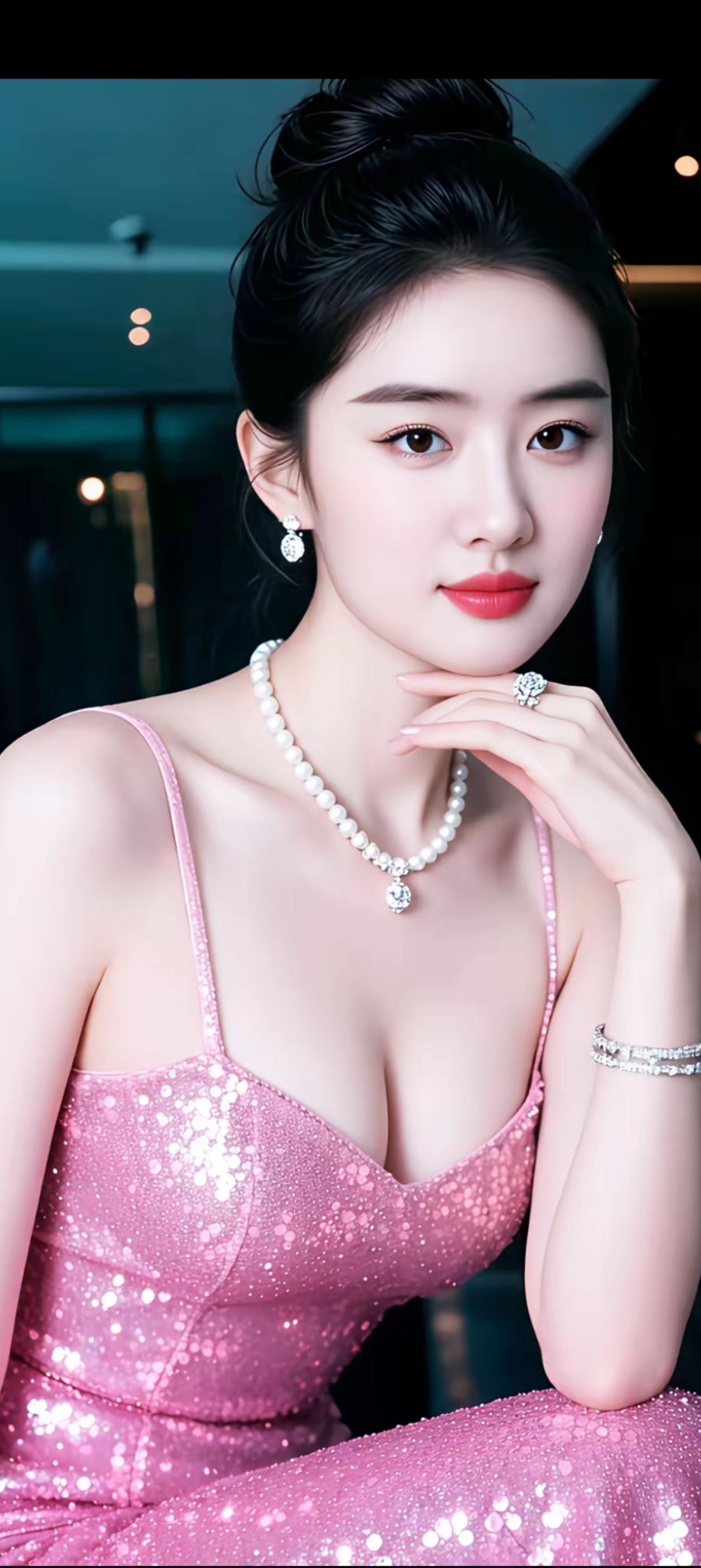 优雅珍珠与闪亮粉裙的完美搭配,尽显迷人魅力!