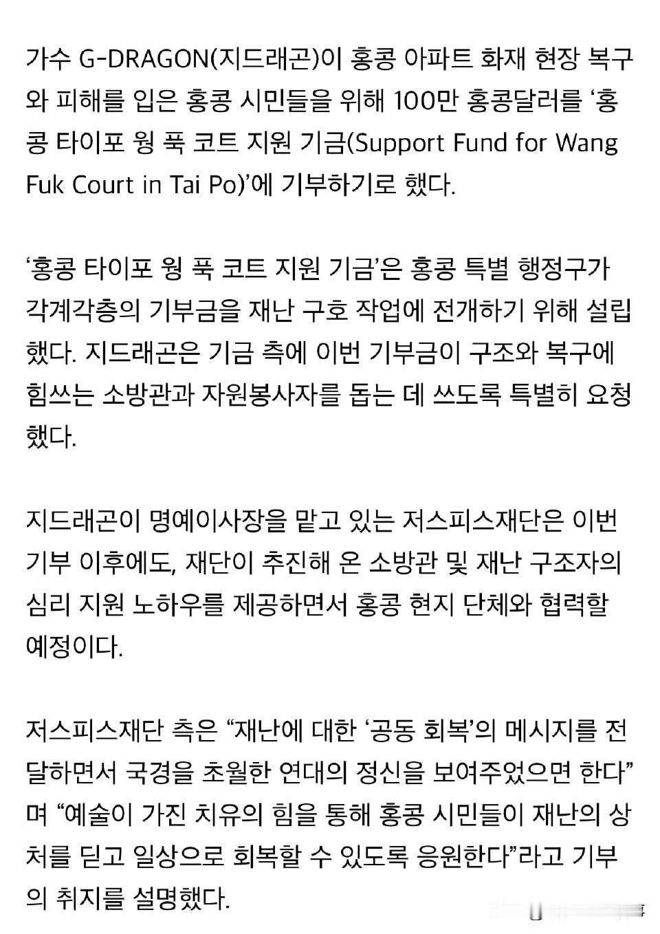 权志龙捐100万港币支援香港!细节太戳心 权志龙用行动诠释善意无国界——以个人名义向香港大埔宏福苑援助基金捐赠100万港币,专项支持火灾受灾市民重建与一线消防员、志愿者帮扶。 他特意绕开中间环节,直接对接香港官方基金,还带着JUSPEACE基金会的心理支持经验助力灾后治愈,这份跨越国境的用心,配上多年持续捐赠的公益底色,真的太圈粉!