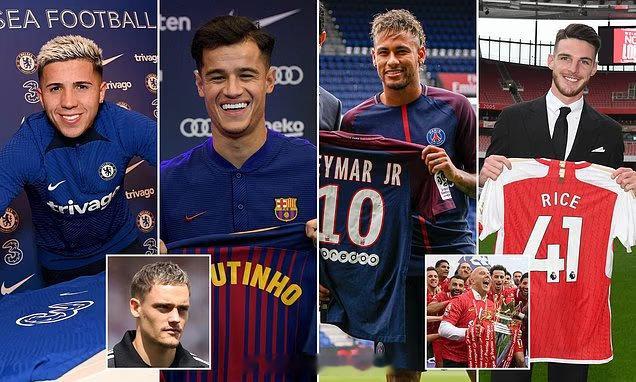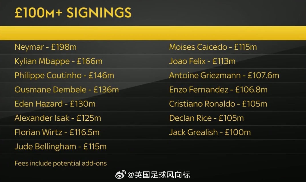 【亿掷千金】足坛史上转会费超过1亿英镑(含浮动条款)的超级大交易:内马尔(巴黎)、姆巴佩(巴黎)、库蒂尼奥(巴萨)、登贝莱(巴萨)、阿扎尔(皇马)、伊萨克(利物浦)、维尔茨(利物浦)、贝林厄姆(皇马)、凯塞多(切尔西)、菲利克斯(马竞)、格里兹曼(巴萨)、恩佐(切尔西)、C罗(皇马)、赖斯(阿森纳)、格拉利什(曼城)。