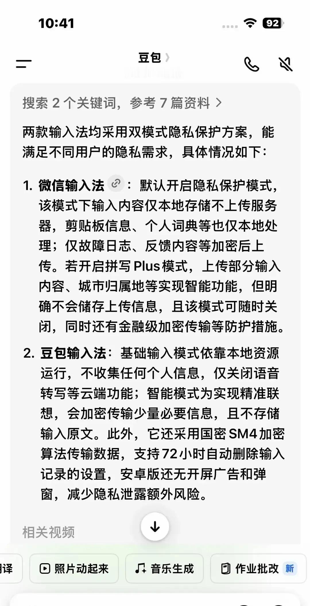 豆包输入法iOS新版把语音键按下去几乎秒出字,我地铁里小声说也能抓准,最香的是打完字关机再开,输入记录全留在手机里,云端连影子都没摸到。之前用某老牌输入法,打完“体检报告”立刻推医院广告,吓得我连夜卸载。现在这感觉像给键盘穿了防弹衣,字往屏幕蹦,却没人偷看。字节这次把隐私做成明牌,连注册都不强制手机号,干净得像刚刷的碗。同行微信输入法也走本地路线,两家杠上,得利的是我们这群天天敲字的打工人。 输入法终于从偷窥狂变守口如瓶的同桌,我放心把心里话交给它。