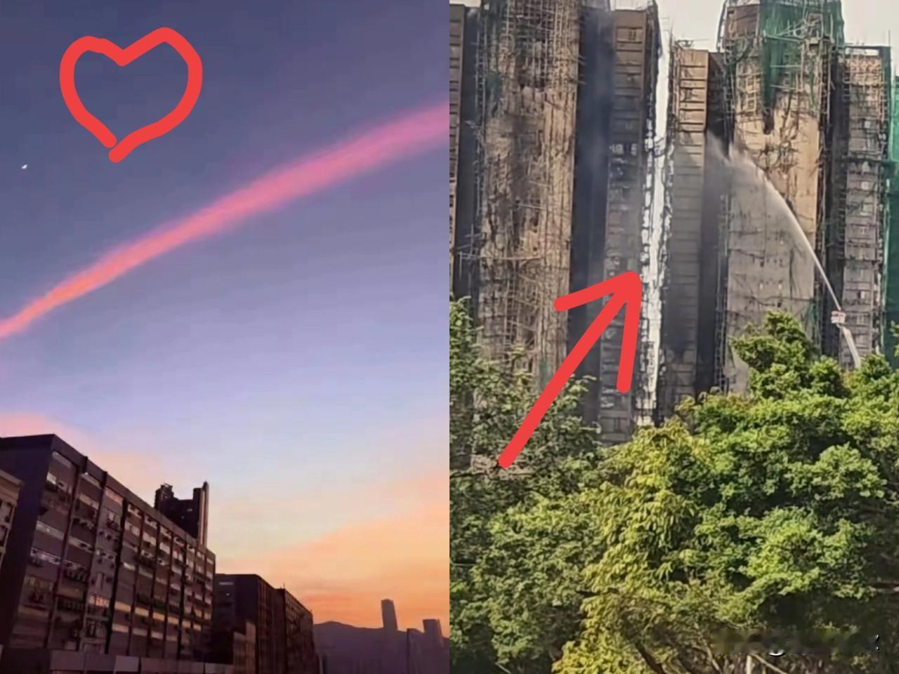 香港大埔火灾后,一抹红云横贯天空,直达西方天际! 浓烟散去,西方天空铺开一片
