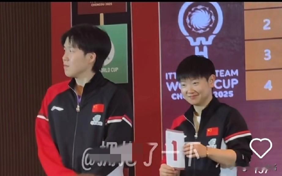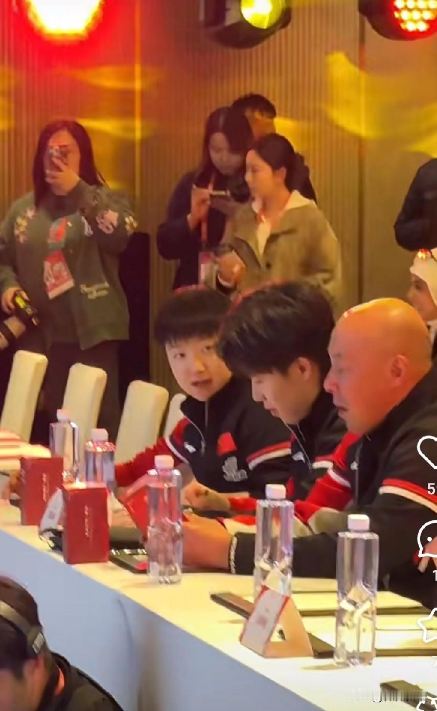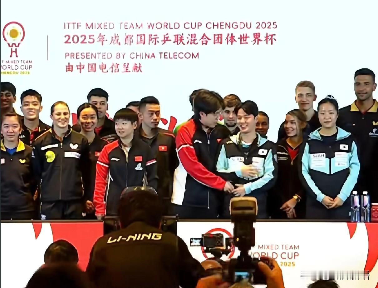 今天是肖导带着莎莎和楚钦一起去抽签了呢,看到两个孩子都挺开心的呢。 在成都挺好的,能打混双比赛也很好。今天下午成都混团比赛的抽签仪式,国乒是派出王楚钦和孙颖莎一起去的,莎莎坐椅子的时候楚钦还帮莎莎拉一下椅子,在台上抽签的时候,王楚钦也是抢着拿牌牌,然后再给莎莎,大家说打球的时候王楚钦抢着接球递给莎莎,现在抽签也得抢着,真的是眼里有活啊。莎莎接过去那个1号时,楚钦还扭过头去憋笑了,莎莎也笑的很开心。 去年王楚钦在抽签现场就画了一幅画,今年又开始作画了,莎莎还看了看。抽签结束后,王楚钦和安宰贤站在一起,莎莎在忙着和后面的人说话,王楚钦在忙着摸安宰贤的肚肚,摄影师让他们站好的时候,王楚钦这次没有把手背过去,这次可以大大方方的和混双搭档站一起拍照了。 今年来成都比赛,楚钦的心情一直都很好啊,昨天下午国乒也开始练混双了,看到一些混双的训练画面,楚钦也练的开心。怪不得莎莎说觉得打混双挺有意思的,对于他俩来说打混双确实充满乐趣,成都混团比赛结束后,紧接着就是总决赛,俩人也要继续打混双,加油!