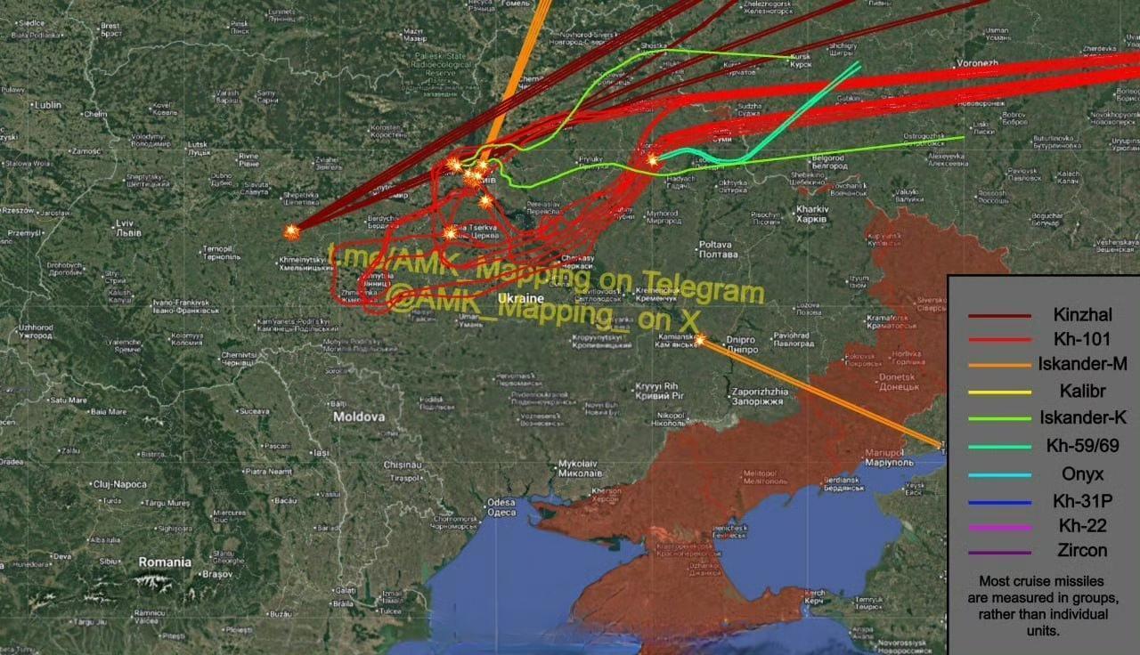 从昨晚到今天早晨(11月28日晚到11月29日早餐),俄罗斯对乌克兰进行了又一轮大规模的导弹和无人机联合袭击。 发射的导弹: 约16枚Kh-101巡航导弹,由2架图-160M战略轰炸机在萨拉托夫州乌兹莫雷村附近的发射线发射。 约12枚Kh-101巡航导弹,由3架土-95MS战略轰炸机在萨拉托夫州乌兹莫雷村附近的发射线发射。 约4枚“伊斯坎德尔-M”弹道导弹,由布良斯克州克林齐西北部的导弹发射装置发射。 约2枚“伊斯坎德尔-M”弹道导弹,由罗斯托夫州塔甘罗格附近的导弹发射装置发射。 约6枚“匕首”高超音速导弹,由6架米格-31K战斗机在梁赞州西南部的发射线发射。 约2枚“匕首”高超音速导弹,由2架米格-31K战斗机在坦波夫州拉斯卡佐夫斯基区的发射线发射。 约2枚“匕首”高超音速导弹,由2架米格-31K战斗机在利佩茨克州利佩茨克市附近的发射线发射。 约3枚“伊斯坎德尔-K”巡航导弹,由沃罗涅日州利斯基附近的导弹发射装置发射。 约3枚“伊斯坎德尔-K”巡航导弹,由库尔斯克州哈利诺空军基地附近的导弹发射装置发射。 约2枚Kh-69巡航导弹,由2架苏-57战斗机在库尔斯克州东部的发射线发射。 ----------------------- 乌克兰防空作战: 截至撰写时,确认乌克兰防空部队拦截了4枚Kh-101导弹。 ----------------------- 此次打击的主要目标是乌克兰的能源基础设施和空军基地。以下地点成为目标: 基辅州CHP-5热电厂(地理位置:50.39317、 30.56947)遭到约12枚Kh-101和4枚“伊斯坎德尔”导弹袭击。 基辅州“扎希德纳”330千伏变电站(地理位置:50.46634、30.25186)遭到了约9枚Kh-101和约6枚“伊斯坎德尔-K”导弹。 赫梅利尼茨基州旧康斯坦丁诺夫空军基地(地理位置:49.74563、27.27000)遭到约8枚“匕首”导弹袭击。 基辅州特里皮利亚热电厂(地理位置:50.1339、30.74764)遭到约3枚Kh-101巡航导弹袭击。 第聂伯罗彼得罗夫斯克州卡缅斯克水电站(地理位置:48.54588、34.54011)遭到了约2枚“伊斯坎德尔-M”导弹袭击。 苏梅州“Pivnichnoukrayinsʹka”750千伏变电站(地理位置:50.69043、33.76914)遭到了约2枚Kh-69导弹袭击。 基辅州CHP-6发电厂(地理位置:50.531699、 30.662307)遭到了约2枚“匕首”导弹。 基辅州比拉采尔科瓦联合热电厂(地理位置:49.79695、30.18896)遭到了约5枚Kh-101导弹袭击。 ----------------------- 由“天竺葵-2”无人机袭击但未使用导弹的其他目标包括: 基辅州斯拉武蒂奇。 基辅州法斯蒂夫。 基辅州伊尔平。 基辅州布查。 基辅州霍斯托梅尔。 基辅州布罗瓦里。 基辅州博里斯波尔地区。 基辅州比拉采尔科瓦。 第聂伯罗彼得罗夫斯克州第聂伯。 第聂伯罗彼得罗夫斯克州杜博维基地区。 第聂伯罗彼得罗夫斯克州特罗伊茨克地区。 哈尔科夫州洛佐瓦。 哈尔科夫州基里利夫卡。 切尔尼戈夫市,切尔尼戈夫州。 切尔尼戈夫市附近未知定居点。 苏梅州克罗列韦茨地区。 波尔塔瓦州未知地区。 此外,俄军使用FAB航空炸弹对哈尔科夫市和顿涅茨克州尼古拉耶夫卡的能源基础设施进行了打击。 请注意,发射的导弹数量可能略高于我列出的数字,因为探测到的导弹数量通常低于实际发射数量。 来源:新西兰信源“AMK_Mapping”