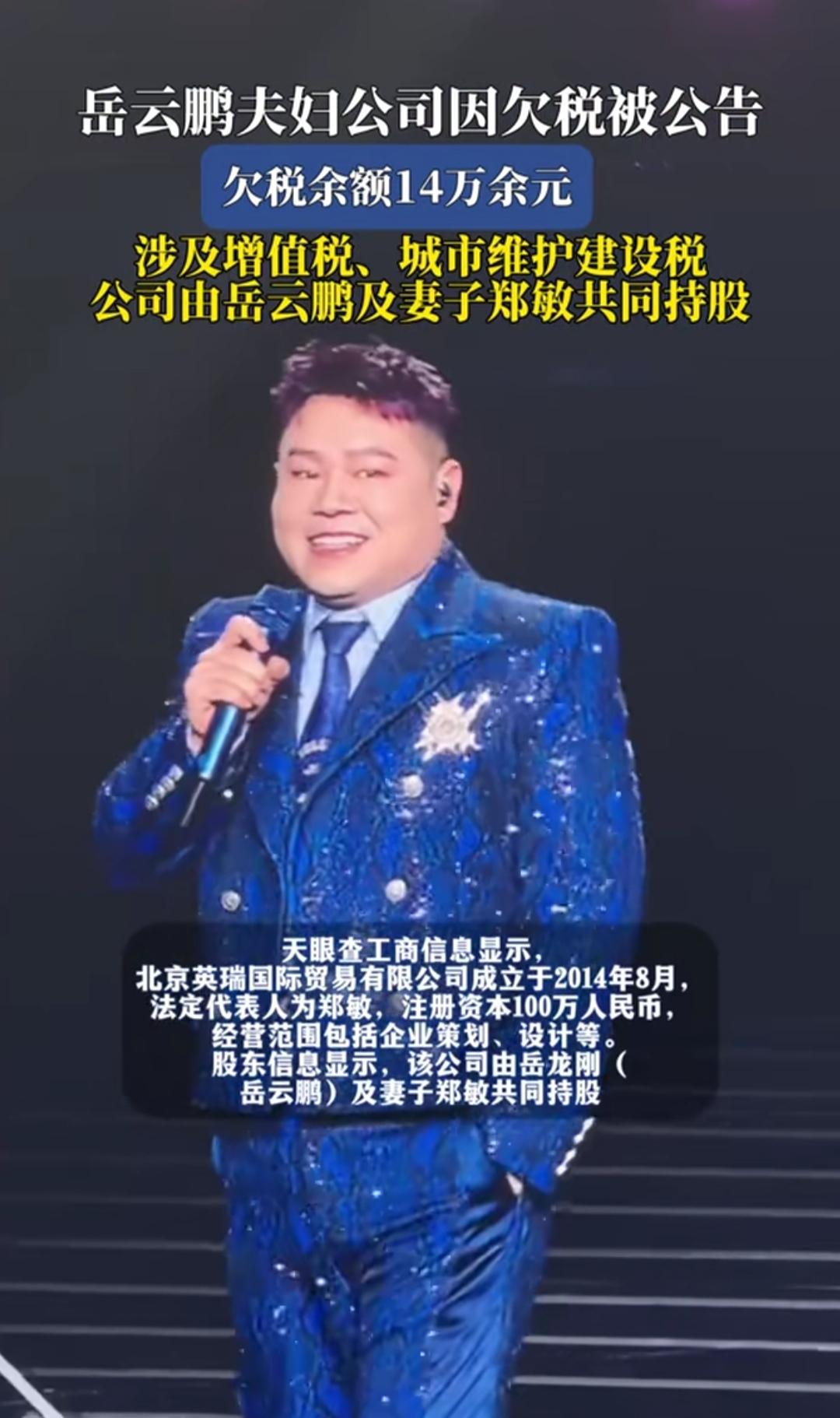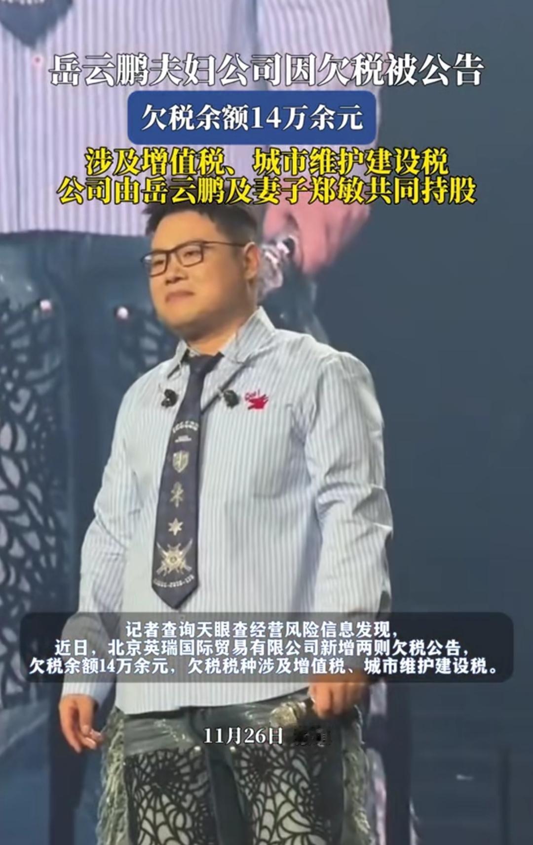 你敢信?明星开的公司,欠了14万的税被公开了——不是多到离谱的数,却比天价瓜更让人心里“咯噔”一下。 岳云鹏和老婆持股的公司,就因为这笔税上了欠税公告。其实14万对他们来说真不算啥,但“该缴的钱没及时缴”这事儿,戳中了太多普通人的共情:咱们上班哪怕晚发一天工资都慌,更别说该尽的责任没到位。 不是说明星就得完美,但“规矩”这事儿不分人。普通人漏缴社保都得慌,公众人物的公司更该拎清——不是苛责,是大家总觉得“被关注的人,更该守住最基本的底线”。 希望是忙忘了赶紧补上吧,毕竟不管是谁,“该做的事儿落到位”,才是最稳的体面。