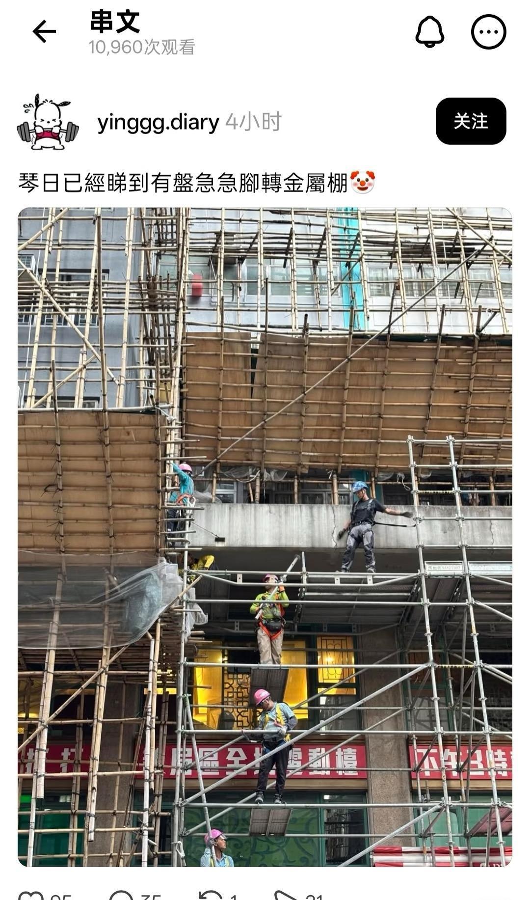 香港已经开始换金属架了。 低楼层,比方说两三层楼用竹子,我觉得问题不大,贫困地区的低楼层,用竹子,更加没问题,但高楼层,用竹子,我认为真的不可取,安全隐患太大了。