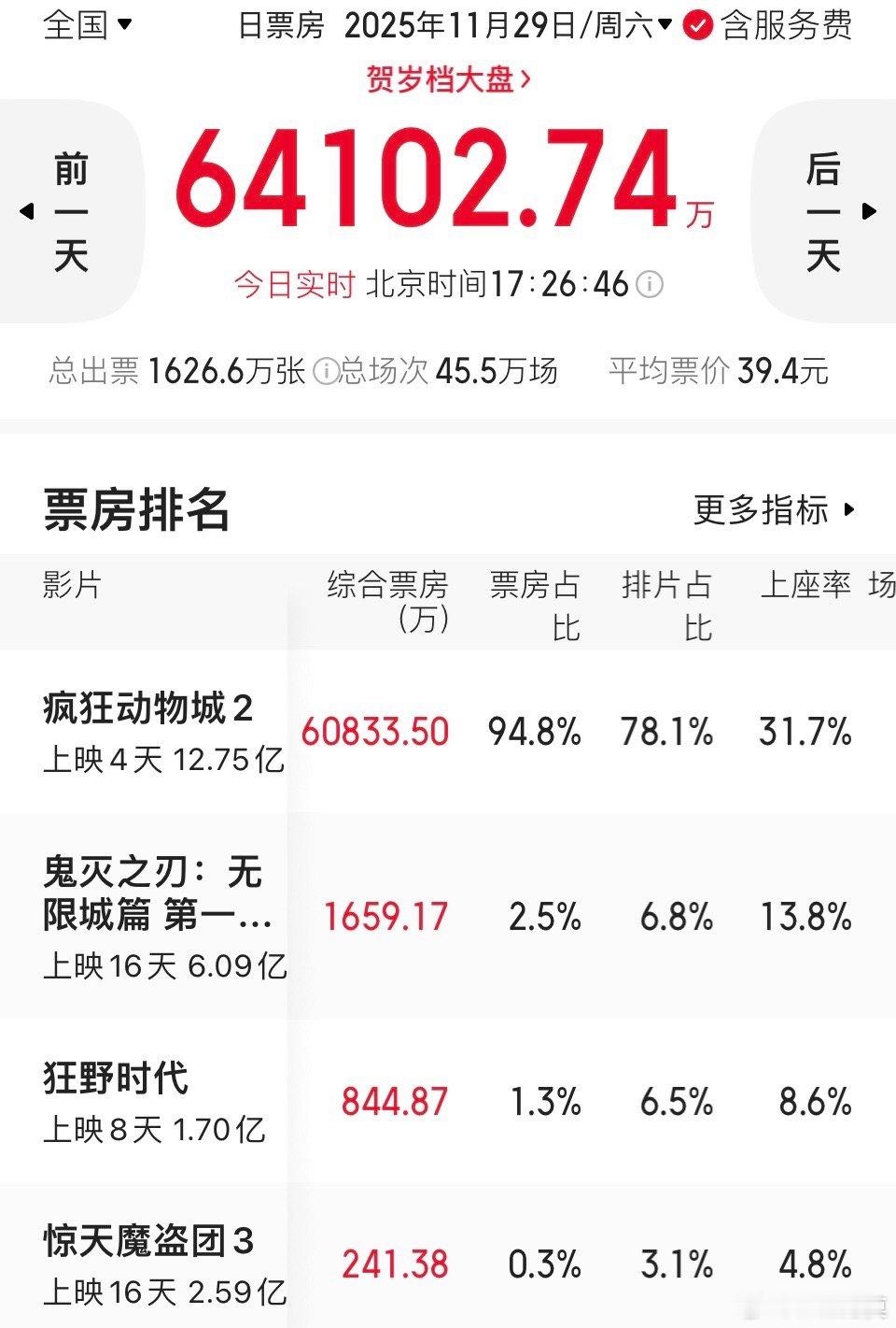 疯狂动物城2单日票房破6亿目前来看,《疯狂动物城2》今天的单日票房有可能破8