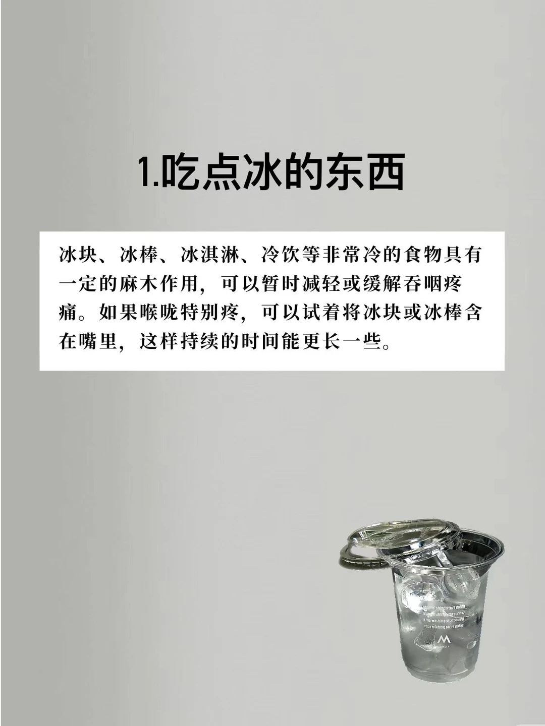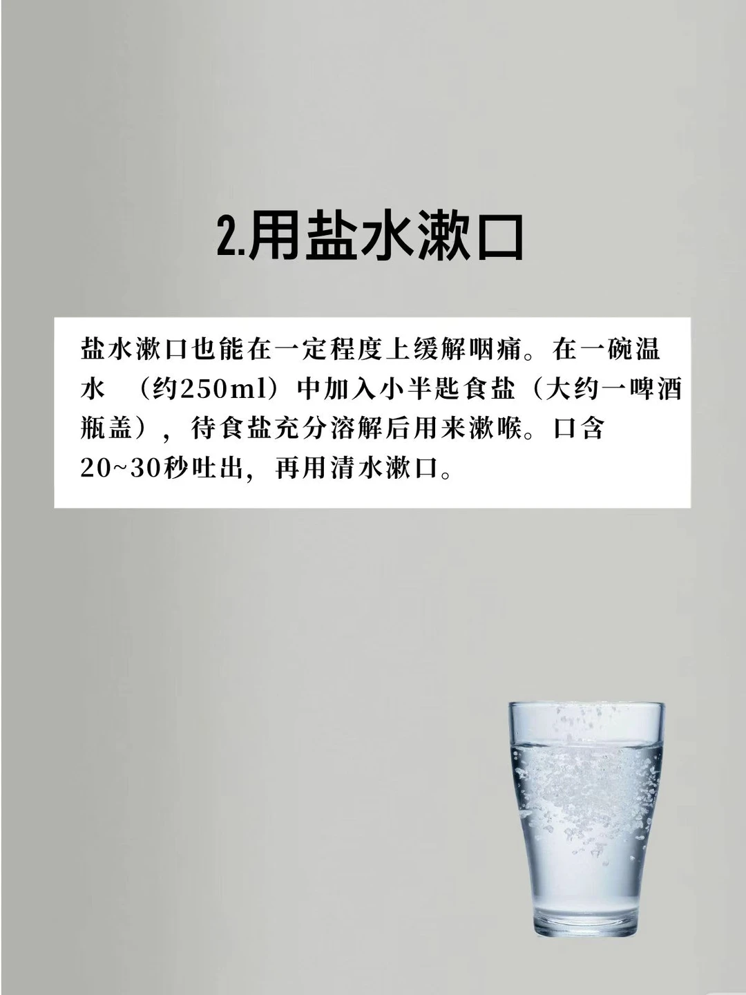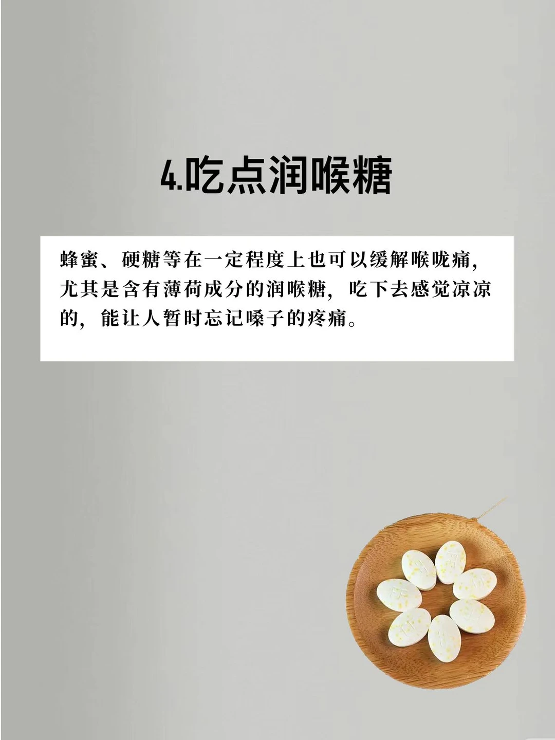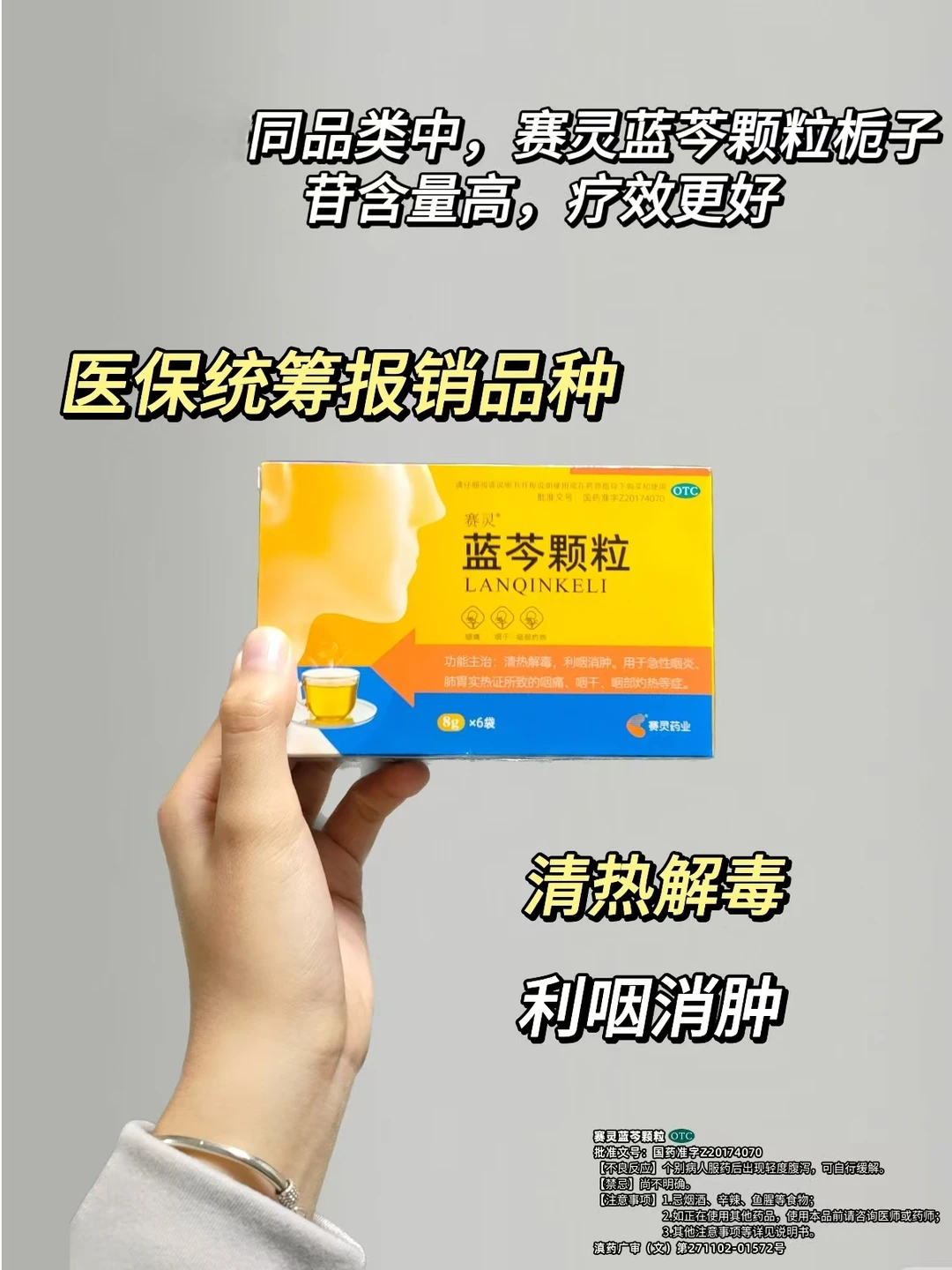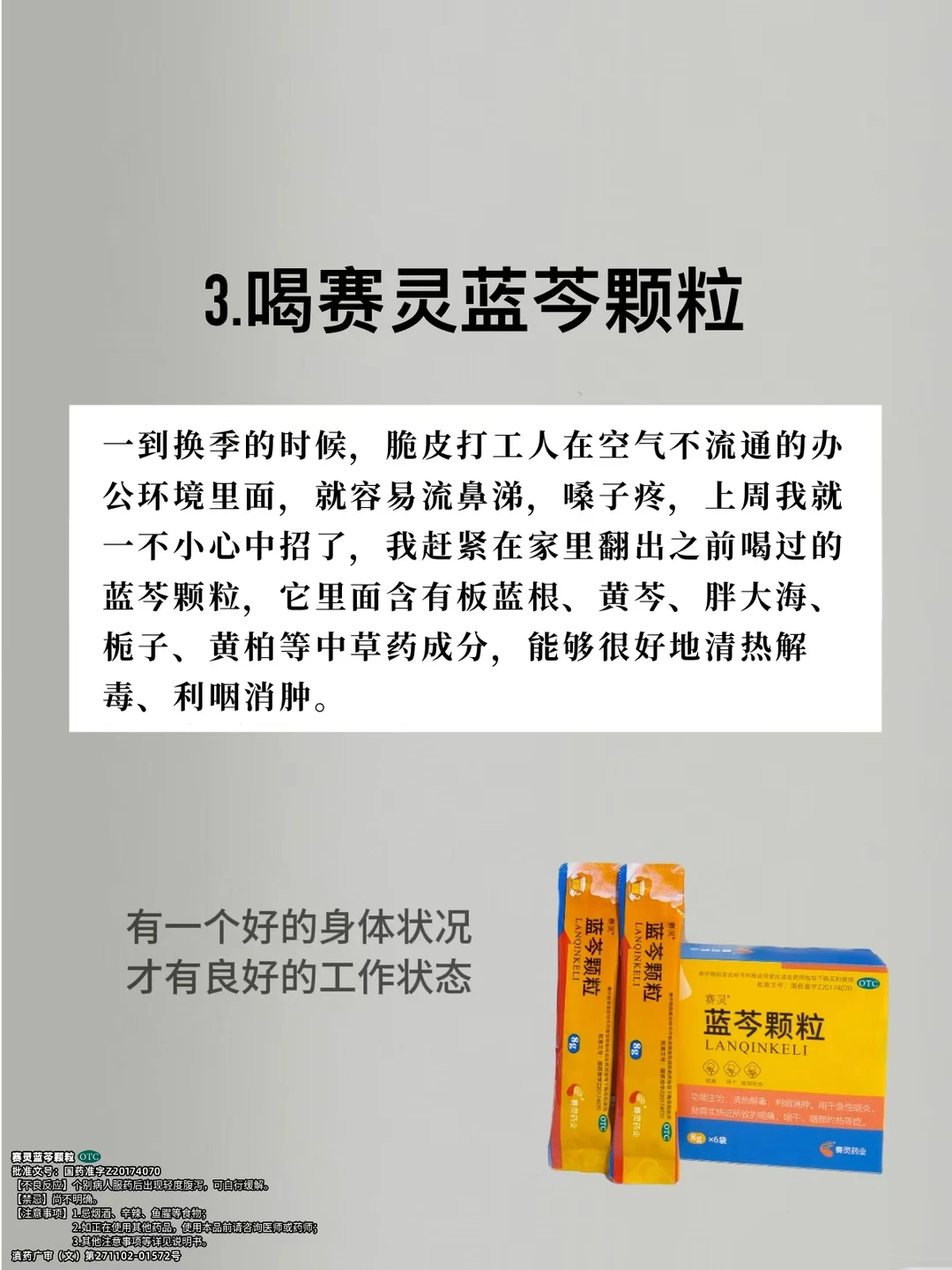 ✅1.吃点冰的东西。 ✅2.用盐水漱口。 ✅3.喝赛灵蓝芩颗粒。 (一到换季的时候,脆皮打工人在空气不流通的办公环境里面,就容易流鼻涕,嗓子疼,上周我就一不小心中招了,我赶紧在家里翻出之前喝过的蓝芩颗粒,它里面含有板蓝根、黄芩、胖大海、栀子、黄柏等中草药成分,能够很好地清热解毒、利咽消肿。有一个好的身体状况才有良好的工作状态) ✅4.吃点润喉糖蜂蜜、硬糖。 请仔细阅读说明书并按说明使用或在药师指导下购买和使用