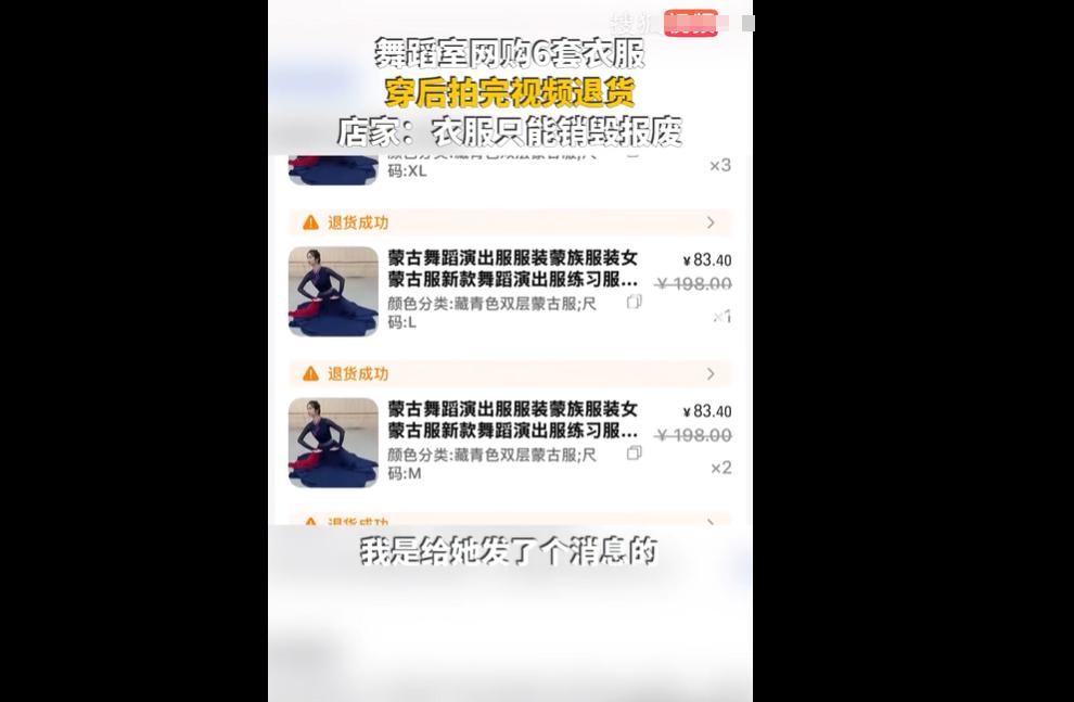 11月28日山东菏泽,李女士的店铺遭一舞蹈室恶意退货:网购6套服装,穿