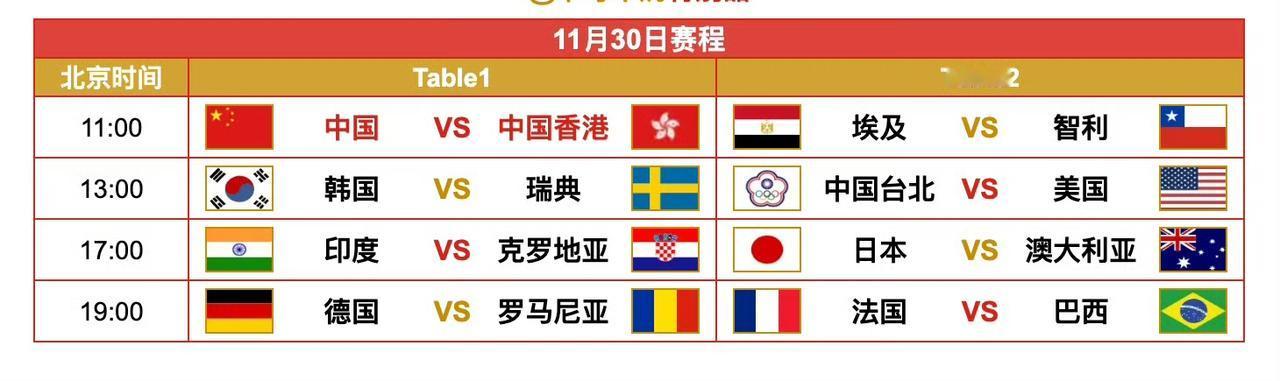 先睹为快[笑哭]! 明日(11月30日,周日)赛程来了! 2025成都混团世界杯11月30日全日赛程如图所示。 上午十一点,处在第一组的🇨🇳中国队首战🆚中国香港队🇭🇰 。 其实港队签位也不错,第一阶段比赛结束后,每个小组将有两支队伍胜出,获得第二阶段的参赛资格,就第一组四支队伍的实力来说,埃及队、智利队晋级无望,也就是中国队和港队了[笑哭]。 明天中午一点整,韩国队和瑞典队的比赛也值得一看。 (感谢草莓老师的图片)