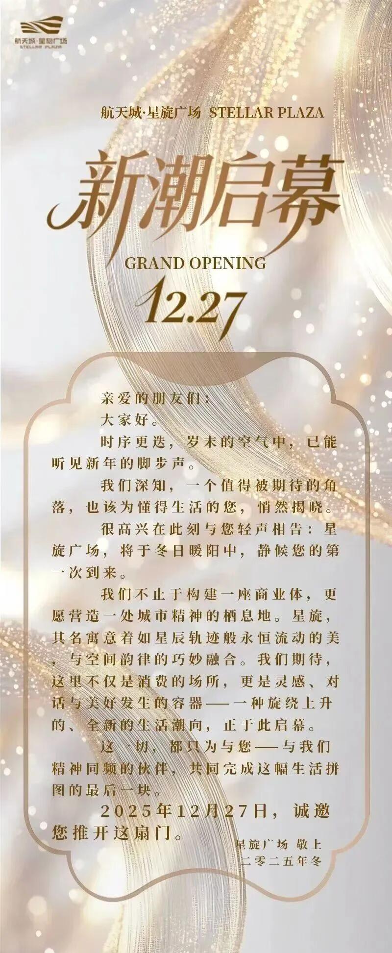 好消息!西安这一大型商业综合体官宣将于12月27日正式开业....将填补片区大型商业空白... 11月28日,西安城南备受瞩目的大型商业项目“星旋广场”发布最新消息,该商业综合体将于12月27日正式启幕.... 星旋广场位于西安航天基地航天南路和航新路十字西北角,总占地约78.38亩,由商业(40.808亩)和体育(占地37.57亩)两个地块组成,包含商业综合体、商业街区及体育综合体多重业态,致力于打造集购物、餐饮、娱乐、休闲于一体的多元化商业综合体。 该商业综合体聚合多元零售、趣味体验、潮流餐饮与文化生活,从LG2到L4+1每层都有明确的主题,多维度业态组合带来全新的消费体验,同时引入多家航天首店、城南首进品牌。 项目周边聚集了大华锦绣前城、山水香堤、融创揽月府、绿城紫薇公馆、山水美树、招商华宇长安玺、招商云山间等已交付小区,还有在售的宸阅澜山、科为揽月臺、大华锦绣年华、德通映南山等;3公里范围内常驻居民超25万,对大型商业体的需求相当迫切。 从2020年便动工建设,期间历经数次开业延期,如今终于要开业了。项目的建成,将满足周边5公里内家庭及办公客群消费者对亲子教育、日常就餐、商务招待、亲朋聚会、休闲娱乐和配套零售的需求。 目前,必胜客、肯德基、长安大牌档、霸王茶姬、秦炉烤肉、兰湘子、朝话里、饺满天下等餐饮品牌,周大福、六福、华为等零售品牌,青藤篮球、MANNER、星巴克、成山农场、陕文投影城等生活方式品牌已率先入驻。