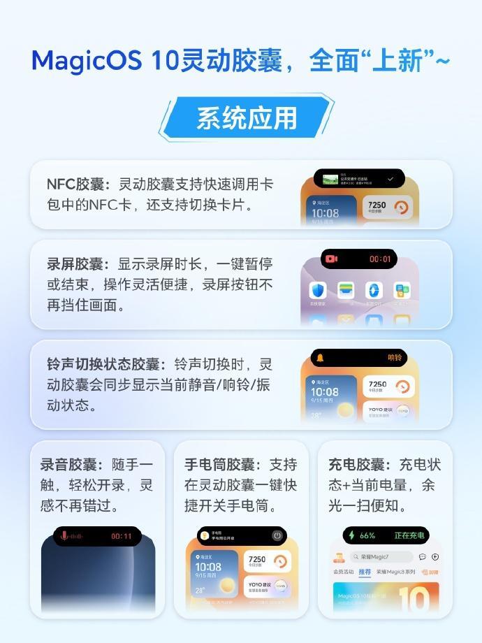 MagicOS 10灵动胶囊最近几个月新增一览,下一步还想要什么?NFC胶囊目前500系列机型首发,正在适配其他机型。耳机佩戴胶囊,不仅是荣耀耳机,其他品牌耳机都在做,适配完毕后阶段放出手电筒也有胶囊了,手电筒亮度调整在回落老机型路上