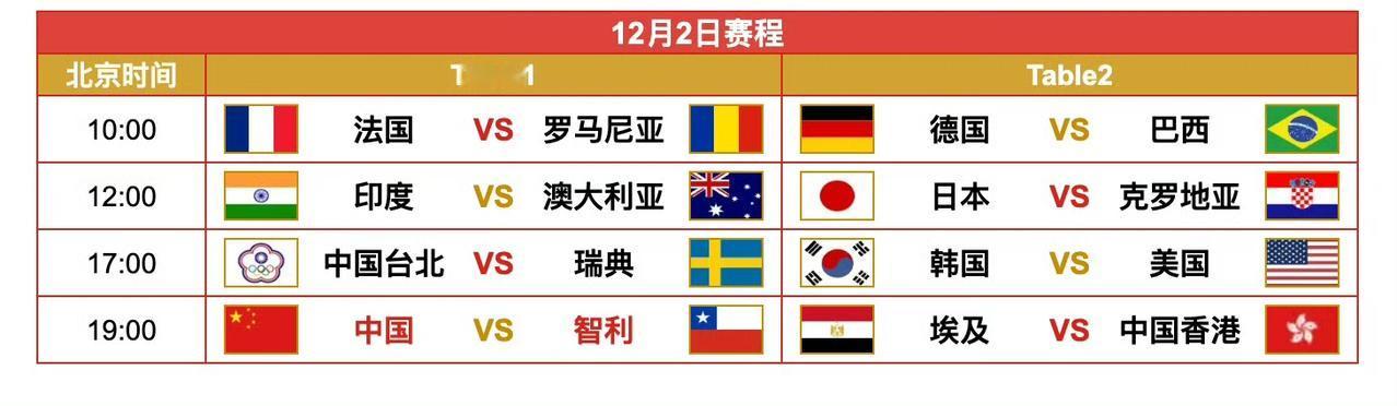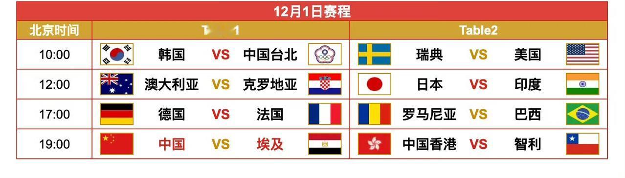 2025成都混团世界杯12月1日、2日全日赛程! 12月1日是下周一,晚上七点,一号台,🇨🇳中国队🆚埃及队🇪🇬 ​​​,无压力观赛哦[笑哭]。 下周一中午十二点,日本队对阵印度队,我们也可以轻松隔岸观火哦[笑哭]。 12月2日,即下周二,还是晚上七点,🇨🇳中国队🆚智利队🇨🇱 ​​​,又可以无压力观赛了[笑哭]。 当然周二晚上五点,中国台北队对阵瑞典队应该颇有看点,台北省队的郭冠宏是一大看点! (感谢草莓老师的图片)