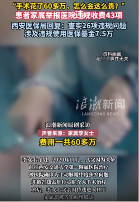 西安,一女子父亲头晕,去医院治疗,不料手术后其父亲陷入昏迷进了ICU,女子不相信医院,决定转院,转院时竟被告知医药费用要60多万,医保报了不到30万,家属支付了30多万,可转院后,其父亲却因手术创伤过大错过最佳治疗期,没救回来,最终因病情过重离世!   “我父亲本来是可以不死的!”每次说起父亲的遭遇,李女士声音里的颤抖都藏不住。只是去医院治个头晕,最后却花光积蓄还没能留住人。   更让她无法接受的是,这场悲剧本是可以避免。却因为医院的一堆违规操作,把父亲的生路一步步堵死了。   2020年11月,李女士的父亲总说头晕,医院给出的检查结果是“主动脉瓣中度狭窄”,还特意强调这病有猝死风险,建议尽快做心脏介入微创手术。   一听可能危及生命,李女士没敢多犹豫,很快就签了同意书。可那时的她根本想不到,这个决定会让父亲再也没能健康地走出医院。   手术结束后,李女士的父亲陷入深度昏迷,人直接被推进了ICU。一家人不敢耽误,决定转院。可没想到结算医药费时,竟收到了60多万的账单。哪怕在医保报销后,还要自费30多万。   李女士咬牙四处凑钱,才把费用结清。然而到了新医院,医生却告诉了她一个遗憾的结果:老人因为之前手术的创伤太大,已经错过了最佳治疗期,能做的补救措施非常有限。   最终,老人家在46天后离世。李女士心里满是悔恨:要是当初没那么轻信,要是早点发现不对劲,父亲是不是就不会走得这么早?   带着满心不甘,李女士翻出了医院的病历和收费清单。看着上面密密麻麻的项目和数字,她越看越觉得奇怪:有些收费项目,她从来没听说过;有些费用,明显比正常价格高得离谱。   带着这些疑问,李女士将该医院举报到了西安市医疗保障局。这一查,就是近5年。直到 2025年8月,医保部门的核查结果终于下来了:医院确实存在26项违规,光违规使用的医保基金就有7万多。   后来,医保部门给李女士发了2200多块的举报奖励,可这点钱,根本弥补不了她失去父亲的痛苦。现在,李女士和医院的诉讼还在继续。一审法院认定医院承担70%的赔偿责任。   其实,这事儿早就不只是李女士一家的私事了。这样的案件并非个例,不杜绝的话,国家医保和老百姓都会受损,甚至付出生命代价。   医保是大家的“救命钱”,某些医院这样虚报项目、乱收费,不仅坑了患者,更是在浪费国家资源,寒了老百姓的心。对此你有什么看法?欢迎在评论区留言讨论。医保   信息来源: 哈尔滨日报丨患者花费60余万元手术后离世,家属追责揭开西交大一附院26项违规问题,一审判决医院承担70%责任 文|墨海 编辑|史叔