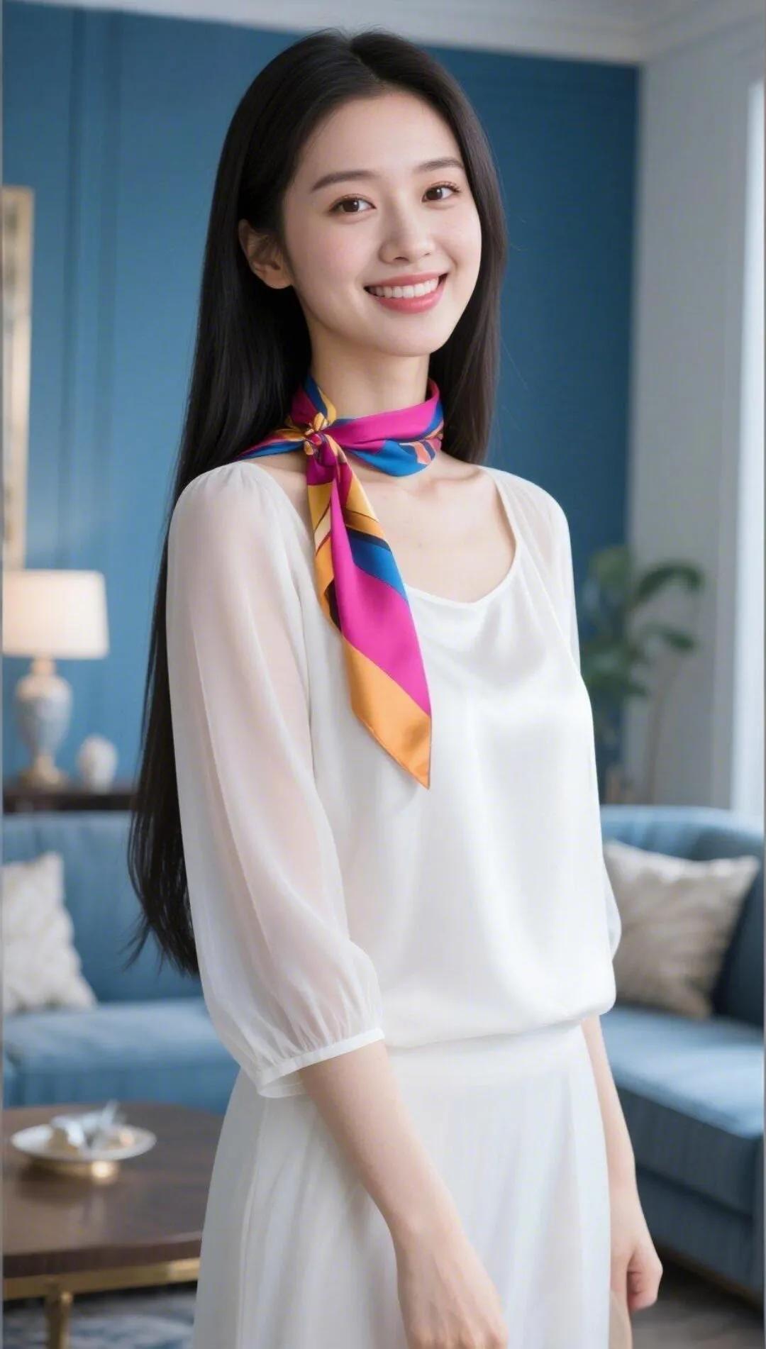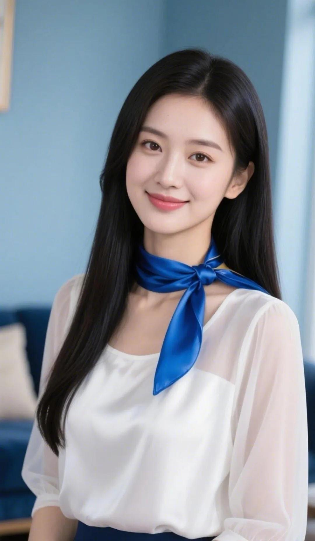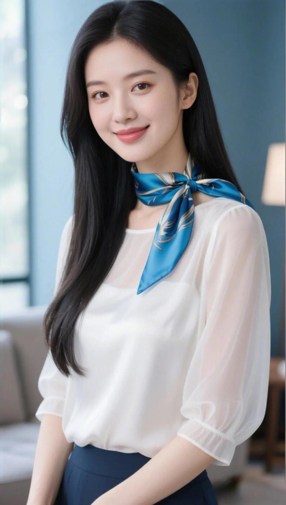 优雅蓝白丝巾,甜美笑容,气质满满!🌟✨
