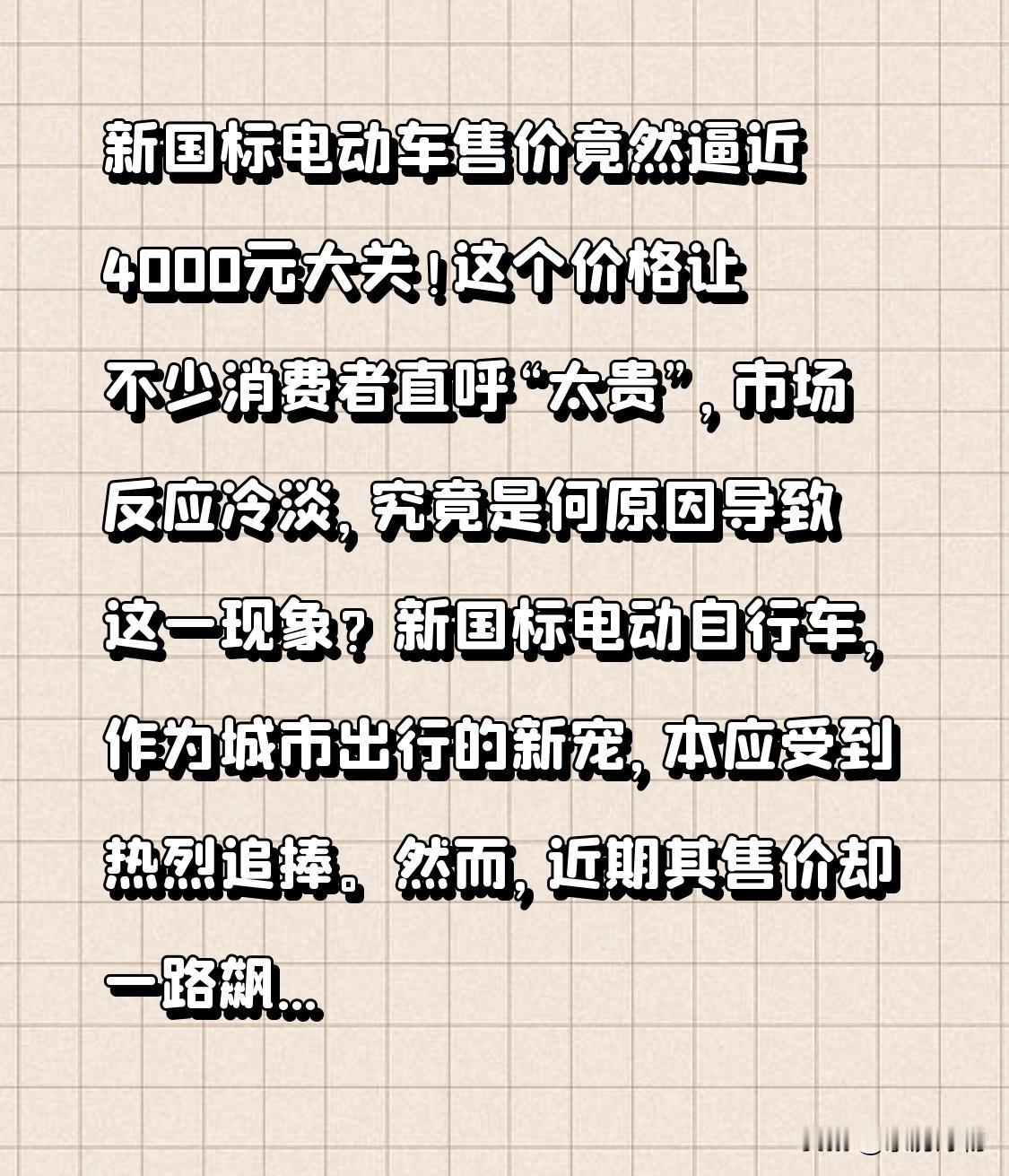 新国标电动车售价竟然逼近4000元大关!这个价格让不少消费者直呼“太贵”,市场反应冷淡,究竟是何原因导致这一现象? 新国标电动自行车,作为城市出行的新宠,本应受到热烈追捧。然而,近期其售价却一路飙升,逼近4000元的高价,让许多消费者望而却步。这背后的原因,一方面是新国标对电动车的各项性能指标提出了更高要求,如电池续航、车身重量、速度限制等,这无疑增加了生产成本。另一方面,随着环保政策的日益严格,电动车的环保标准也在不断提高,这也间接推高了售价。然而,尽管新国标电动车在性能和环保方面有所提升,但消费者对于价格的敏感度依然很高。许多消费者表示,他们更倾向于选择性价比更高的产品,而不是盲目追求高价。因此,新国标电动车要想在市场上站稳脚跟,还需要在价格和性能之间找到更好的平衡点。 新国标电动车售价高昂,市场反应冷淡,这既是挑战也是机遇。希望厂商能够倾听消费者声音,不断优化产品,让更多人享受到绿色出行的便利。大家对此有何看法?快来评论区留言讨论吧! 电动车规定 电瓶车新交规 电动车新限制 新电动车新规 电瓶车新规 电瓶车新国标 电动自行车国标