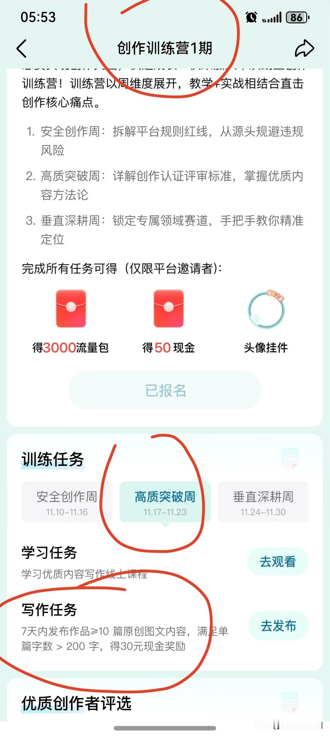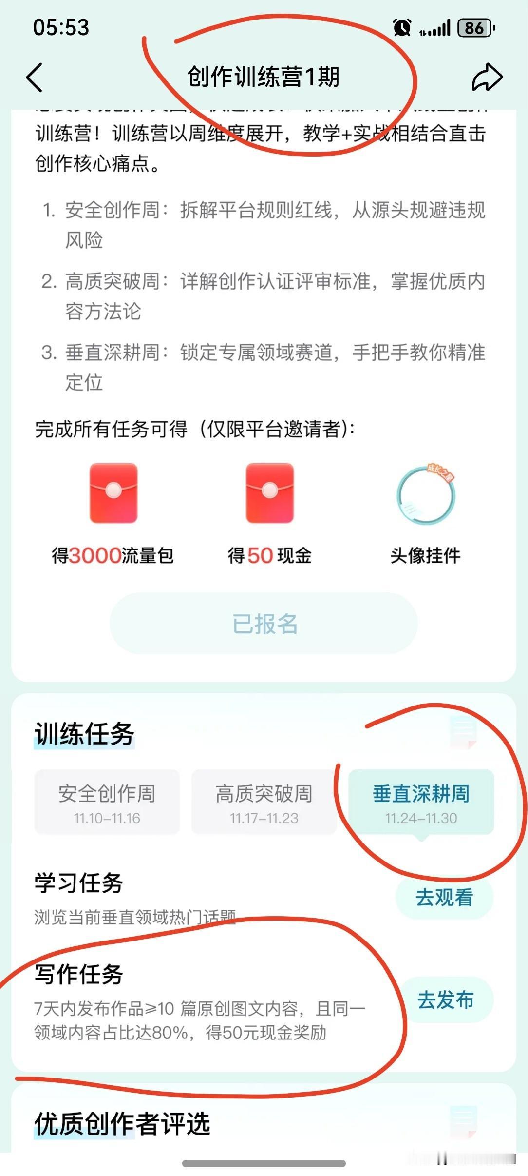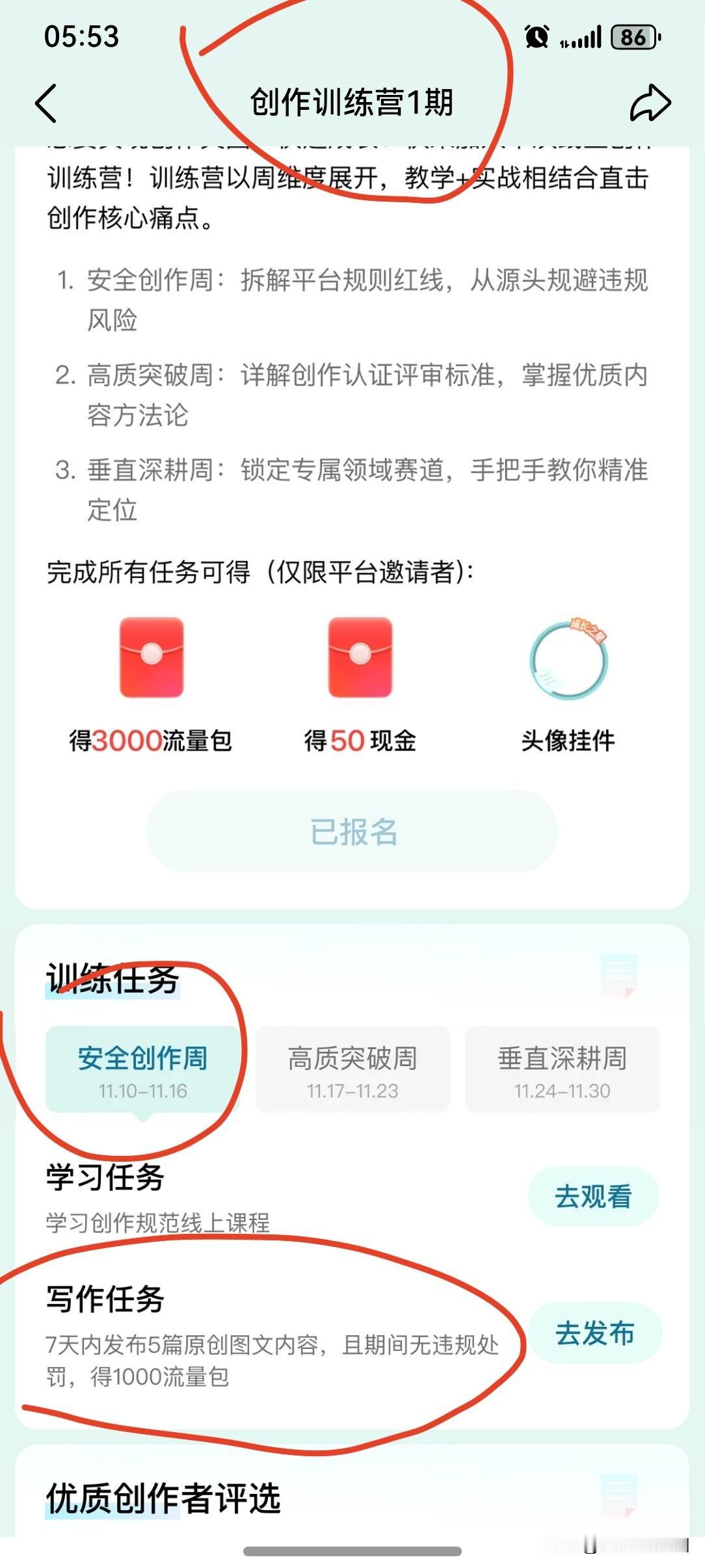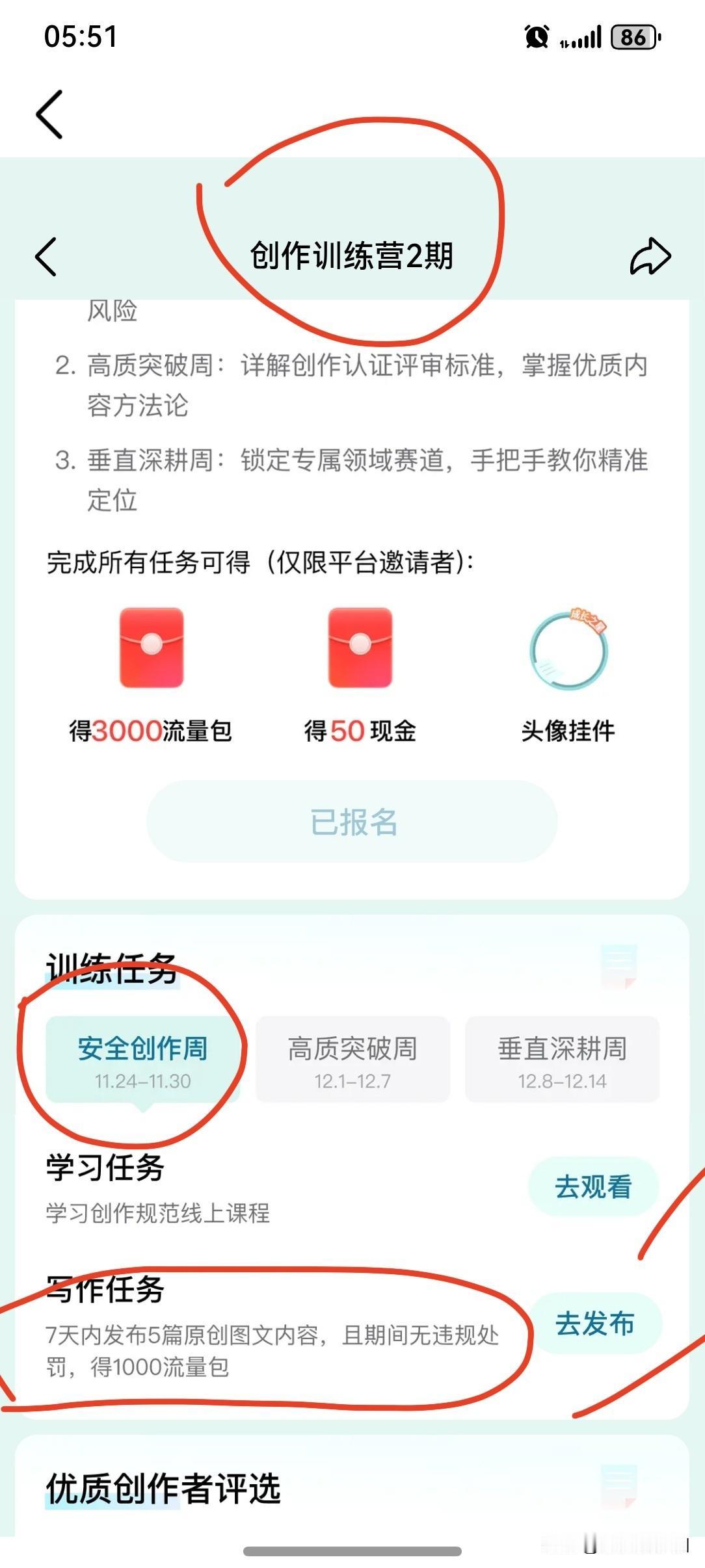 原来今日头条创作训练营真的有两个活动,分别是创作训练营1期和创作训练营2期。之前有好友问我也有点疑惑,今天仔细看了看,原来真的不一样呢! 创作训练营2期 安全创作周(11.24-11.30) 写作任务: 7天内发布5篇原创图文内容,且期间无违规处罚,得1000流量包 创作训练营1期 垂直深耕周(11.24-11.30) 写作任务: 7天内发布作品≥10篇原创图文内容,且同一领域内容占比达80%,得50元现金励。 两个活动的时间都是本周11月24~30日,但写作任务不一样,相应的奖励也不一样!