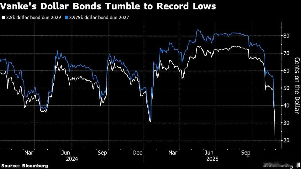 万科债券暴跌! 近期,中国房地产巨头万科陷入困境,提议推迟偿还一部分本地债券,导致债券价格大跌,创历史新低。 具体情况:万科曾是中国销售额最大的房地产开发商计划推迟偿还12月15日到期的20亿元人民币(约2.83亿美元)债券本金其2027年到期的美元债券价格暴跌,跌幅高达60%,创下2017年发行以来的最低水平,早盘跌至约23美分。 影响:债券价格暴跌,投资者损失惨重这标志着中国房地产行业持续低迷,万科的困境反映了整个行业的压力。来源:彭博社
