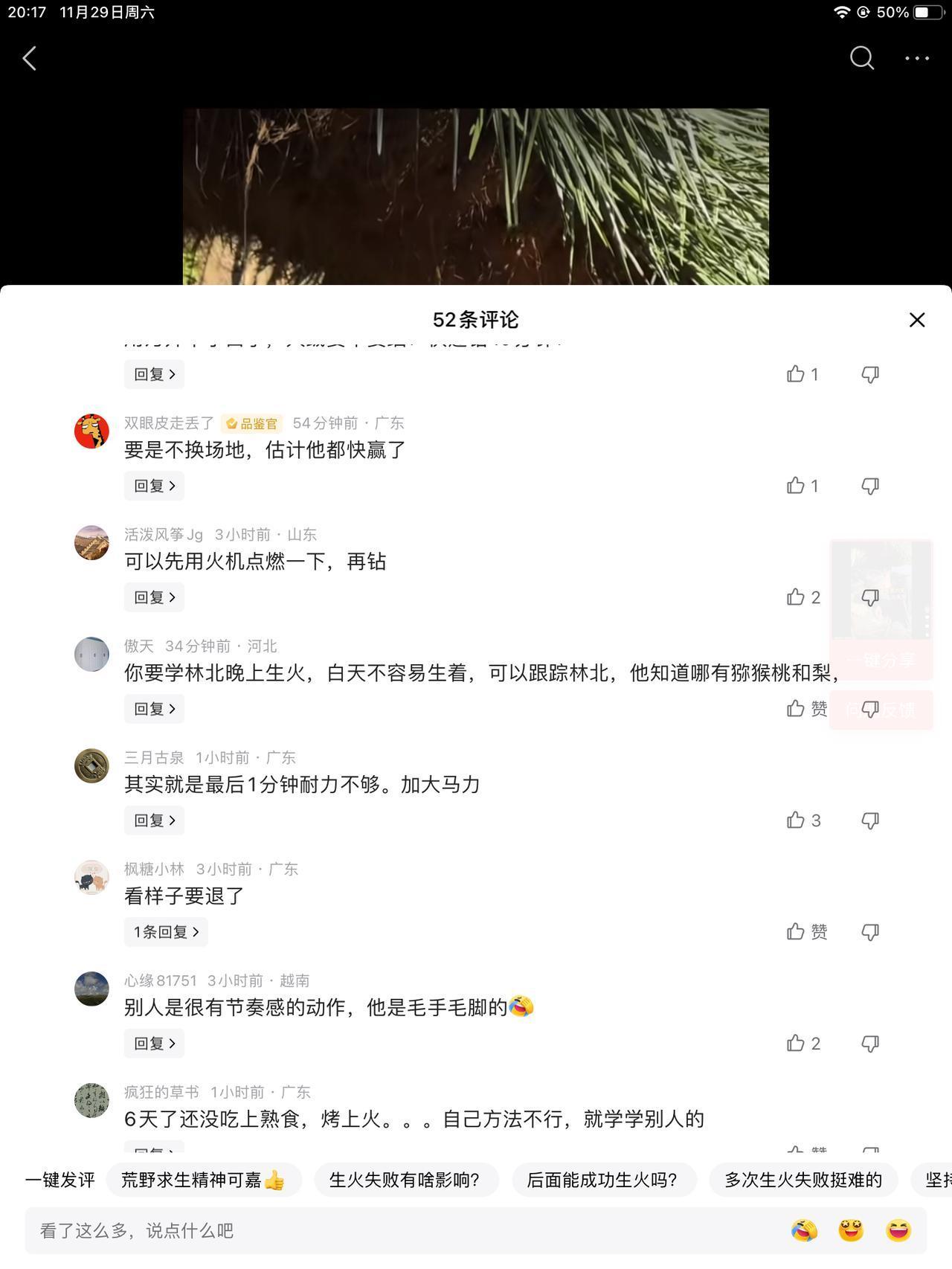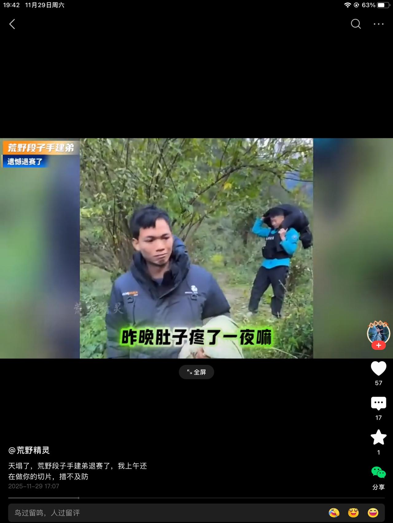荒野求生退赛潮来了,冠军估计很快就出来了! 20号摔了腿,疼的不得了,无奈退了。17号建弟没了哥哥的呵护,一个人吃的不好,昨晚肚子疼了一夜。今天上午还憧憬十天拿奖金,下午就退赛了。刚发现建弟还挺逗比的,这老小子就退赛了! 好吧,江湖路远,咱们后会有期! 还有那个张老六,六天了,还没生着🔥。吃生食哪个也比不了道友,41天,那是绝唱啊!下山就请教老师,现在也是有火的人。林北的🔥备受质疑,视频也没人拍到。半夜就生起了🔥。不能不让人说。他,也年轻,那力道,不应该生不着。