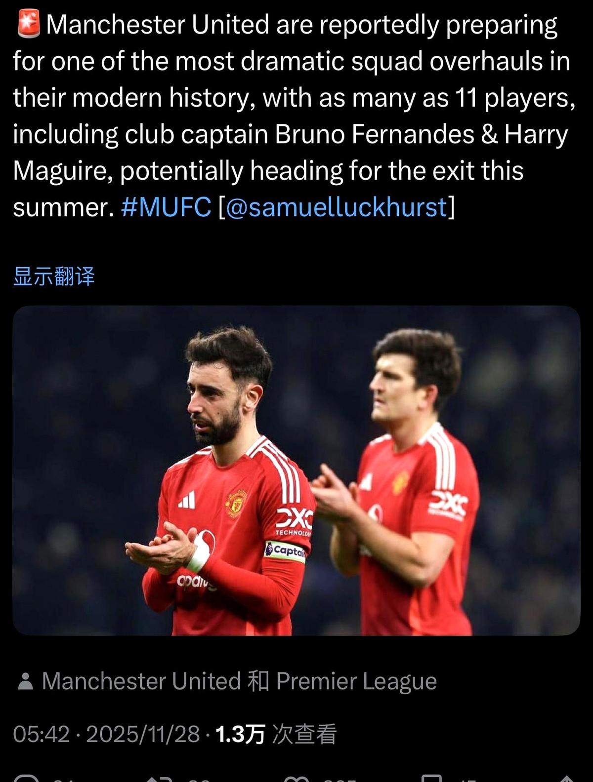 曼联2026年夏天要搞大清洗,还是近代最猛的那种。据说要走11个球员,连队长布鲁诺·费尔南德斯和哈里·马奎尔都在名单里。 其实俱乐部是不是真要重建,关键就看B费走不走。他是队长啊,要是连他都留不住(或者说俱乐部愿意放),那才说明是动真格的,不是光卖几个边缘人凑数。现在曼联成绩起不来,阵容确实得换血,但核心球员的去留才是真信号。