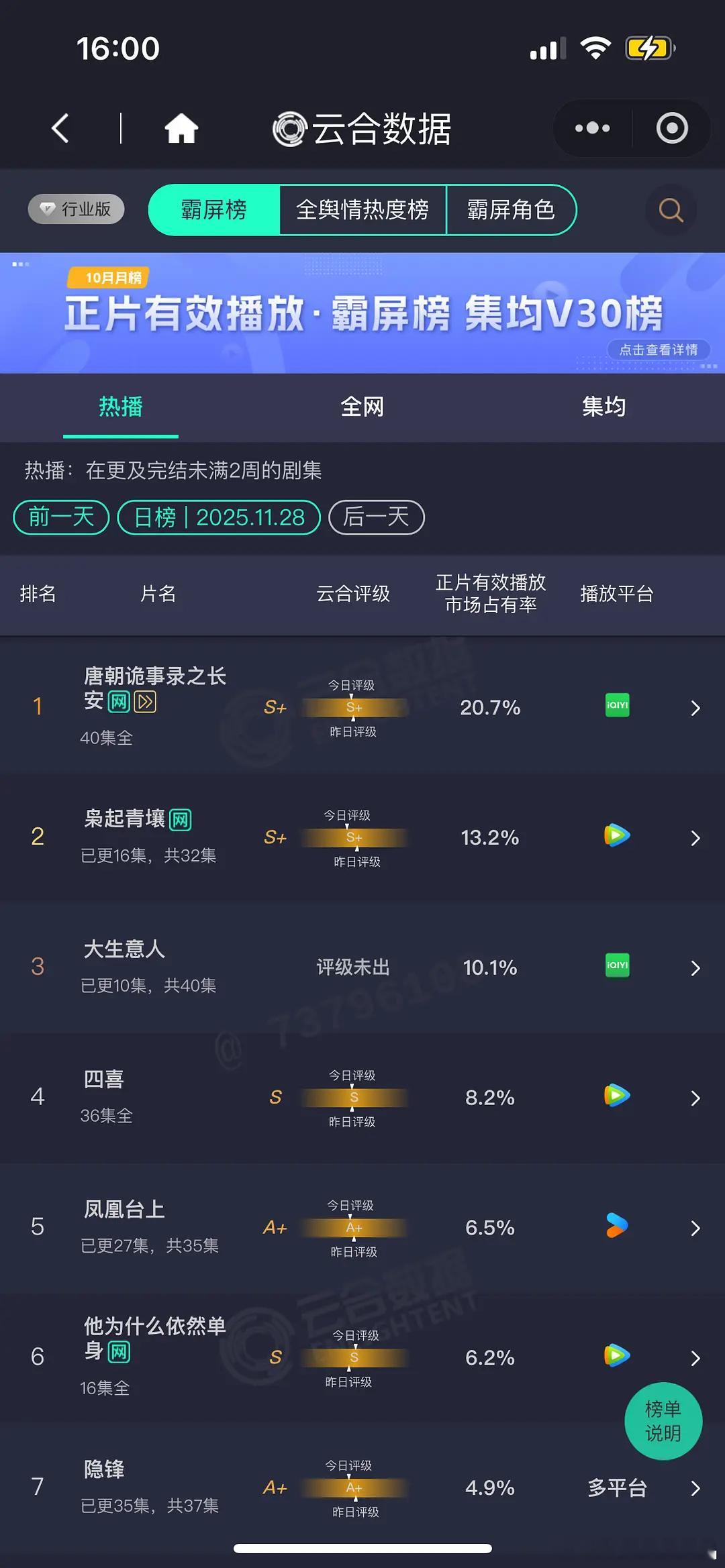 11.28 云合 唐朝诡事录之长安20.7% 枭起青壤13.2% 大生意人10.1%凤凰台上6.5%